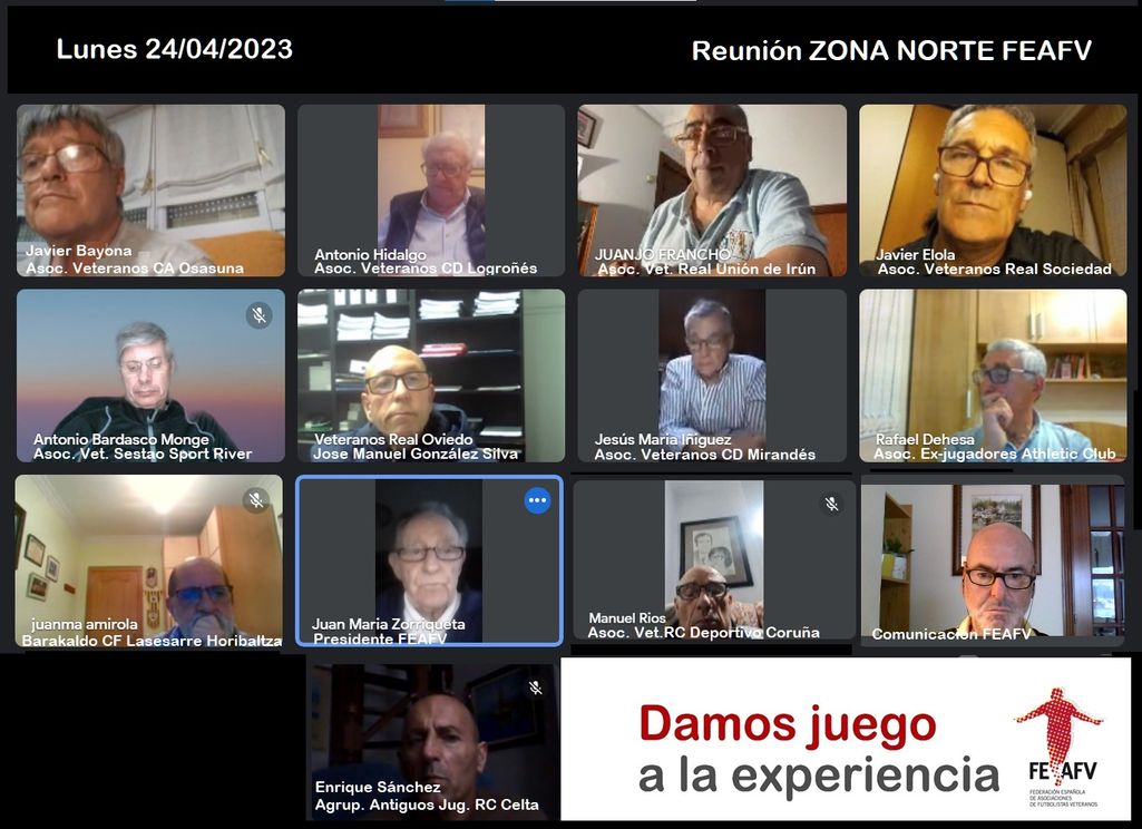 Redacción, 12 de mayo de 2023. Celebradas telemáticamente las reuniones de la diferentes zonas de la Federación. Un encuentro con dos puntos esenciales en el orden del día: Situación de la Federación Española de Asociaciones de Futbolistas Veteranos – FEAFV – y la organización de la nueva edición del Torneo Solidario FEAFV 2023.