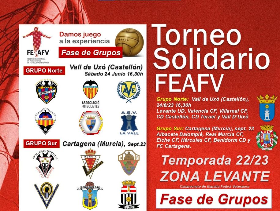 Redacción, 22 de junio de 2023. El próximo sábado 24 de junio la localidad castellonense de la Vall de Uxó acogerá la primera sede del Torneo Solidario FEAFV – Zona Levante. Tras esta primera sede correspondiente al Grupo Norte de la Zona Levante, será la localidad de Cartagena (Murcia) la que acoja el Grupo Sur allá por el mes de septiembre.