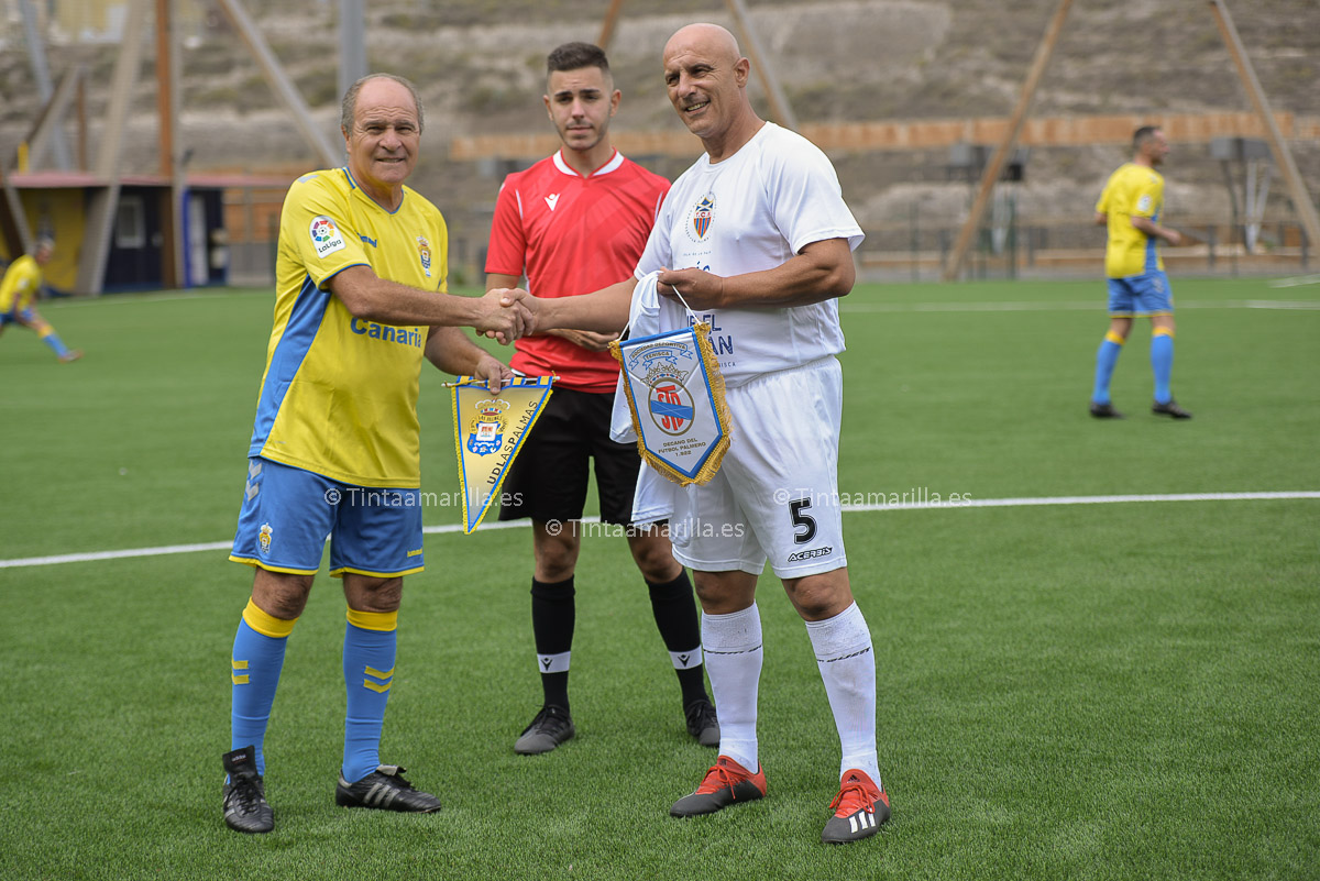 Las Palmas de Gran Canaria, 9 de noviembre de 2021. Bajo los lemas “La Unión Hace La Palma” y “Más fuertes que el volcán”, los equipos de veteranos de la UD Las Palmas y el S.D. Tenisca tuvieron una jornada de convivencia mostrando su la isla de , que está sufriendo las “embestidas” del volcán de Cumbre Vieja.