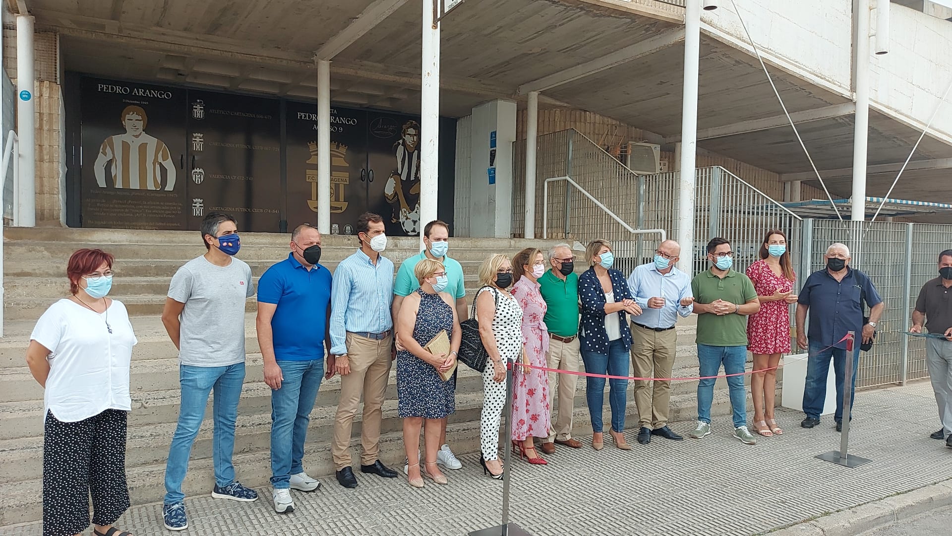 Cartagena (Murcia), 9 de agosto de 2021. Los nombres de Alejandro Sagarduy ‘Jabato’ y Pedro Arango ya ocupan el lugar que merecen en dos de las puertas del Estadio Municipal Cartagonova, en un acto en el que se ha rendido homenaje a dos personas que son historia del futbol de Cartagena y del FC Cartagena.
