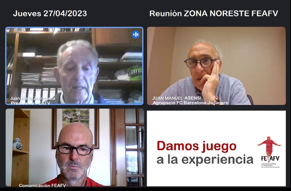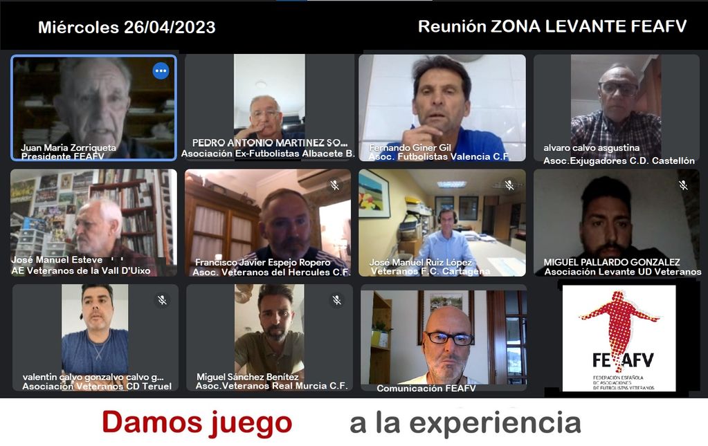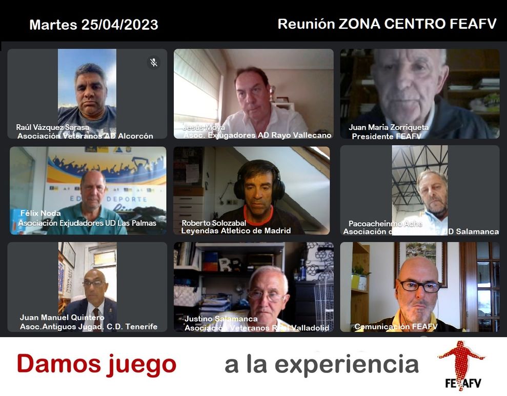 Redacción, 12 de mayo de 2023. Celebradas telemáticamente las reuniones de la diferentes zonas de la Federación. Un encuentro con dos puntos esenciales en el orden del día: Situación de la Federación Española de Asociaciones de Futbolistas Veteranos – FEAFV – y la organización de la nueva edición del Torneo Solidario FEAFV 2023.