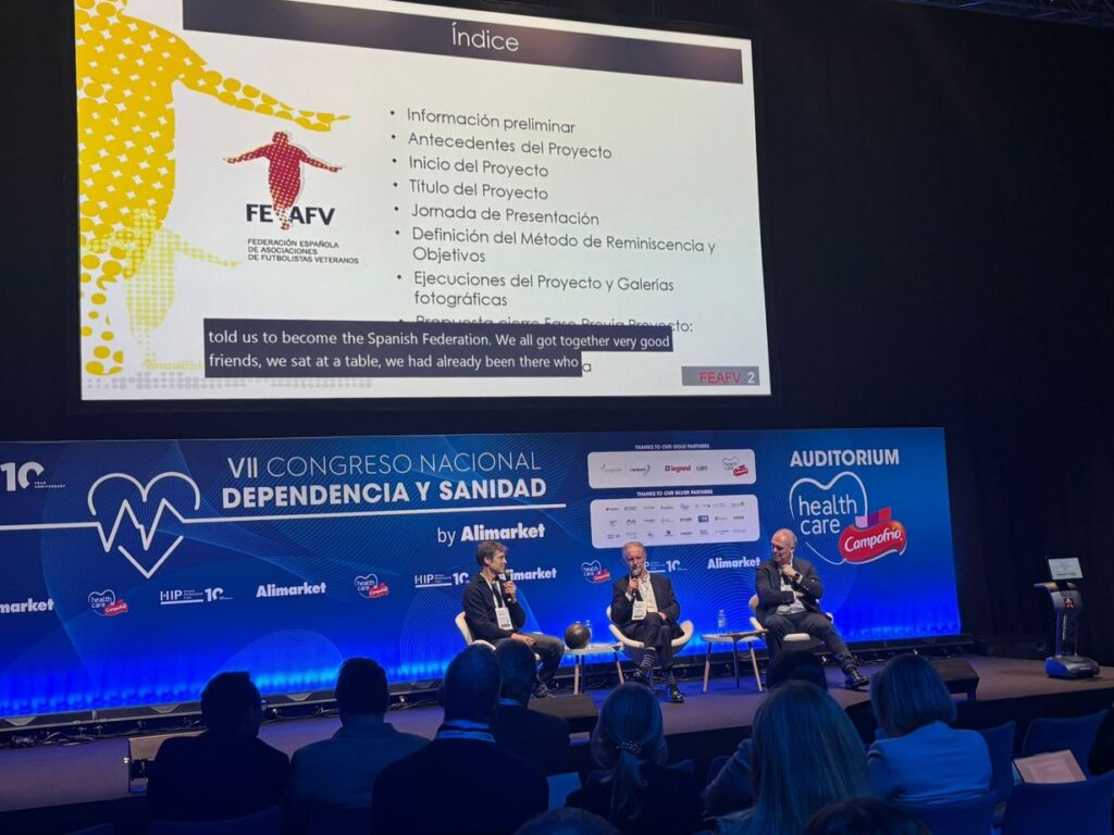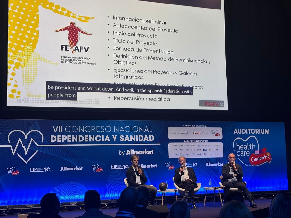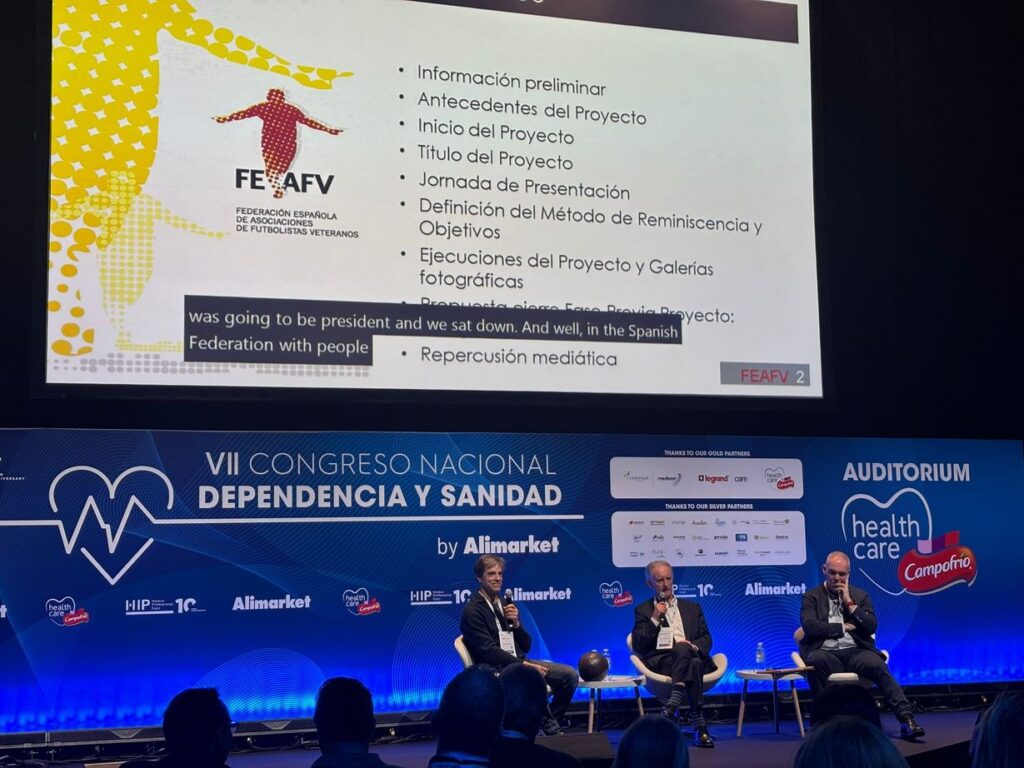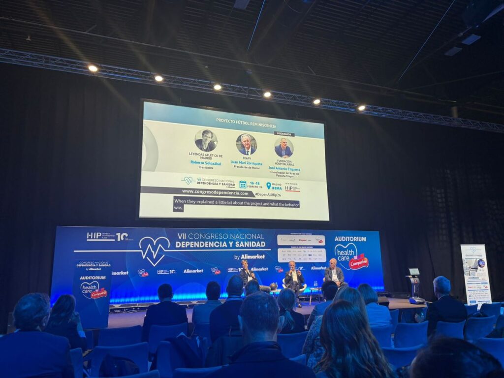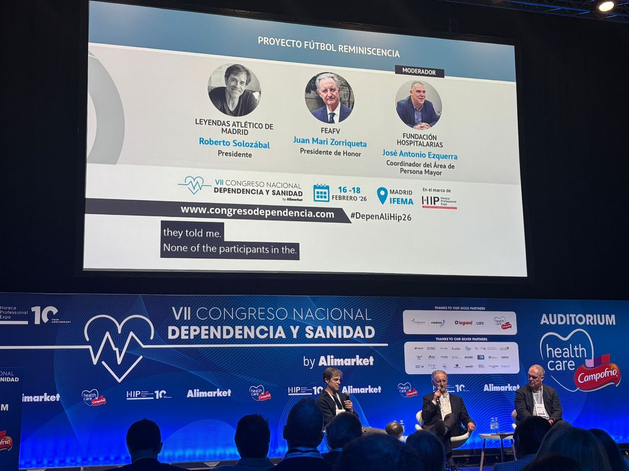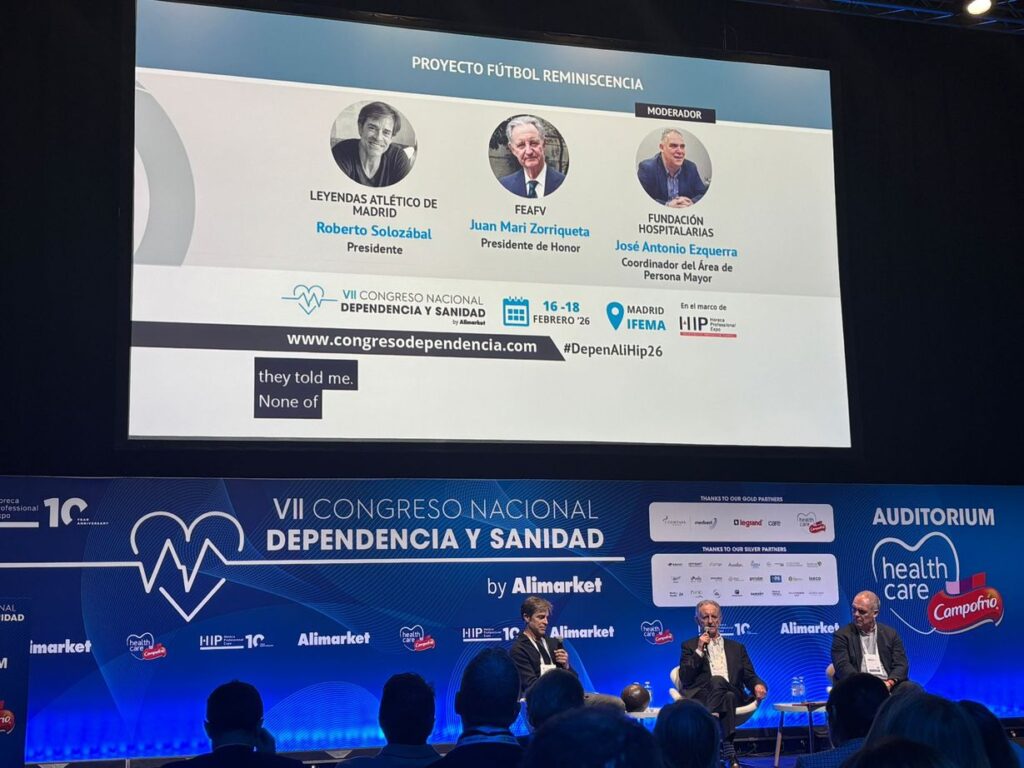 Redacción, 18 de febrero de 2026. El pasado lunes 16 Juan Mari Zorriqueta (Presidente de Honor de la FEAFV), Roberto Solozábal (Presidente de la FEAFV y de la Asociación Leyendas del Atlético de Madrid), José Ezquerra Iribarren (Psicólogo Especialista en Psicología Clínica Coordinador Línea Persona Mayor en FUNDACION HOSPITALARIAS EUSKADI) y Joaquín Anocibar (Responsable Comunicación FEAFV) se desplazaron hasta la Feria de Madrid IFEMA en representación de la Federación Española de Asociaciones de Futbolistas Veteranos invitados al «VII Congreso Nacional Dependencia y Sanidad» a exponer nuestro «Proyecto Fútbol Reminiscencia», una terapia de reminiscencia no farmacológica basada en el fútbol y que llevamos realizando desde el 2013 por toda la geografía española a través de las Asociaciones miembros de la FEAFV con el apoyo y financiación de la FUNDACION LALIGA.