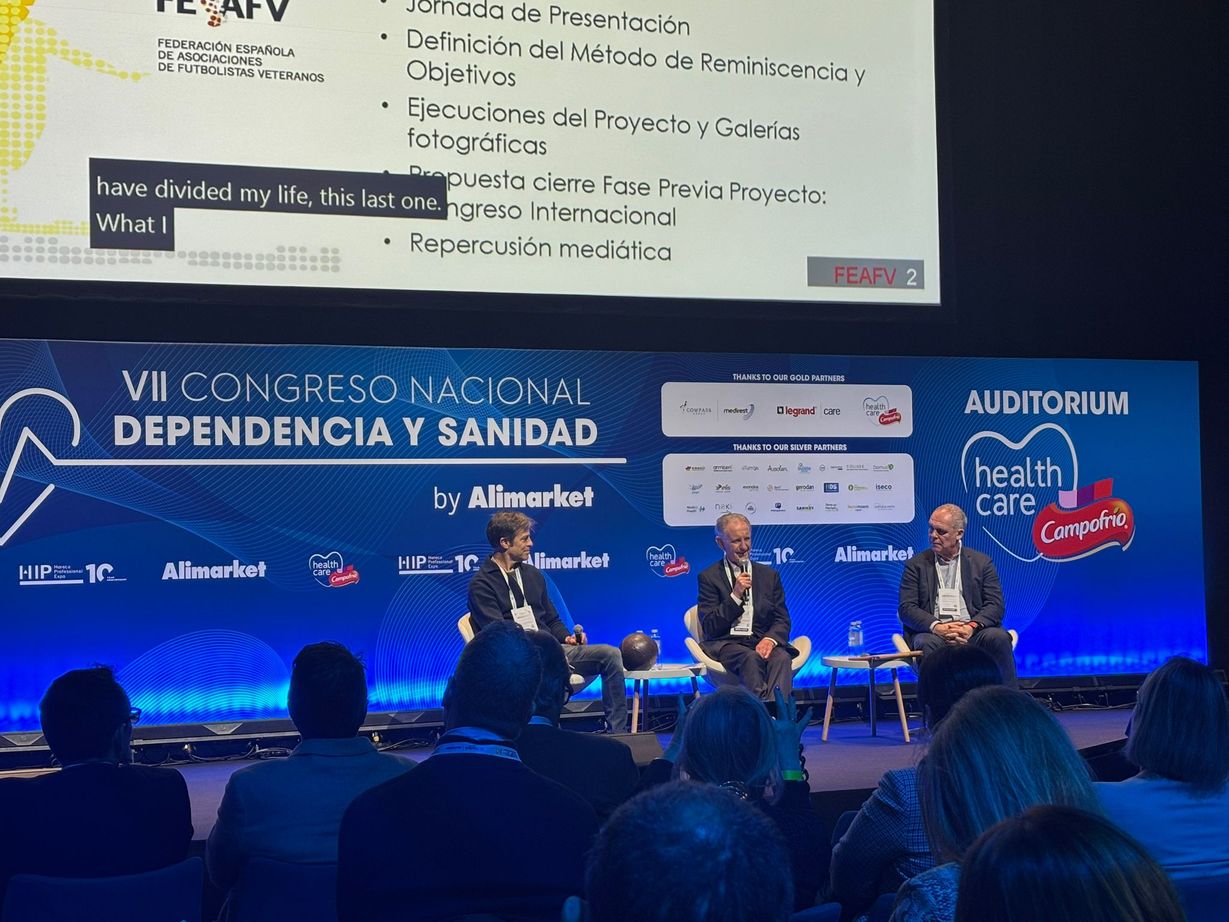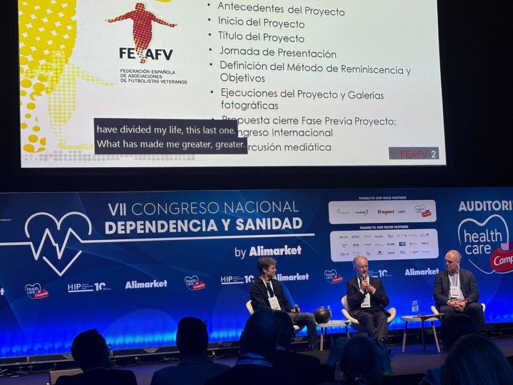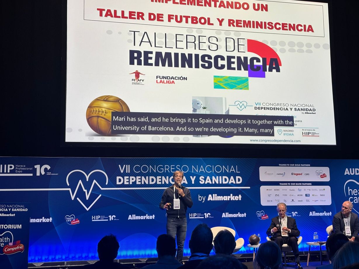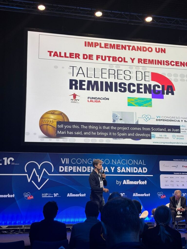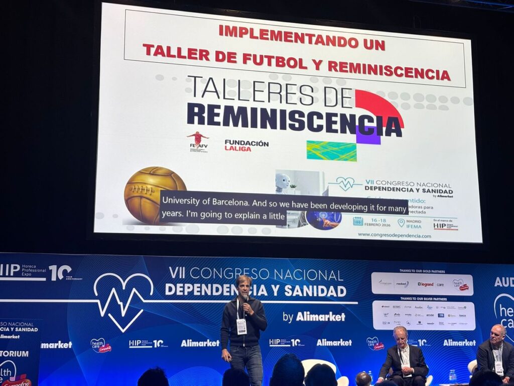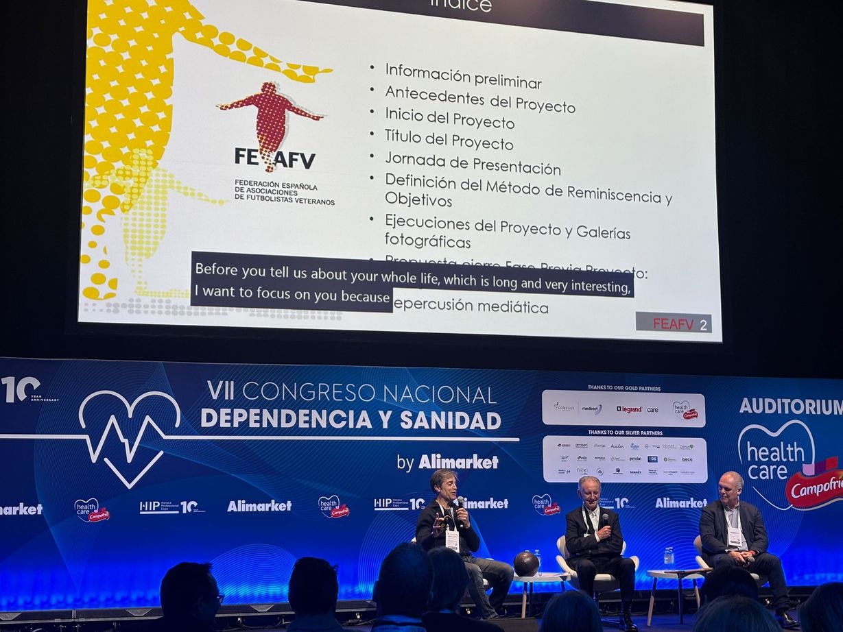Redacción, 18 de febrero de 2026. El pasado lunes 16 Juan Mari Zorriqueta (Presidente de Honor de la FEAFV), Roberto Solozábal (Presidente de la FEAFV y de la Asociación Leyendas del Atlético de Madrid), José Ezquerra Iribarren (Psicólogo Especialista en Psicología Clínica Coordinador Línea Persona Mayor en FUNDACION HOSPITALARIAS EUSKADI) y Joaquín Anocibar (Responsable Comunicación FEAFV) se desplazaron hasta la Feria de Madrid IFEMA en representación de la Federación Española de Asociaciones de Futbolistas Veteranos invitados al «VII Congreso Nacional Dependencia y Sanidad» a exponer nuestro «Proyecto Fútbol Reminiscencia», una terapia de reminiscencia no farmacológica basada en el fútbol y que llevamos realizando desde el 2013 por toda la geografía española a través de las Asociaciones miembros de la FEAFV con el apoyo y financiación de la FUNDACION LALIGA.