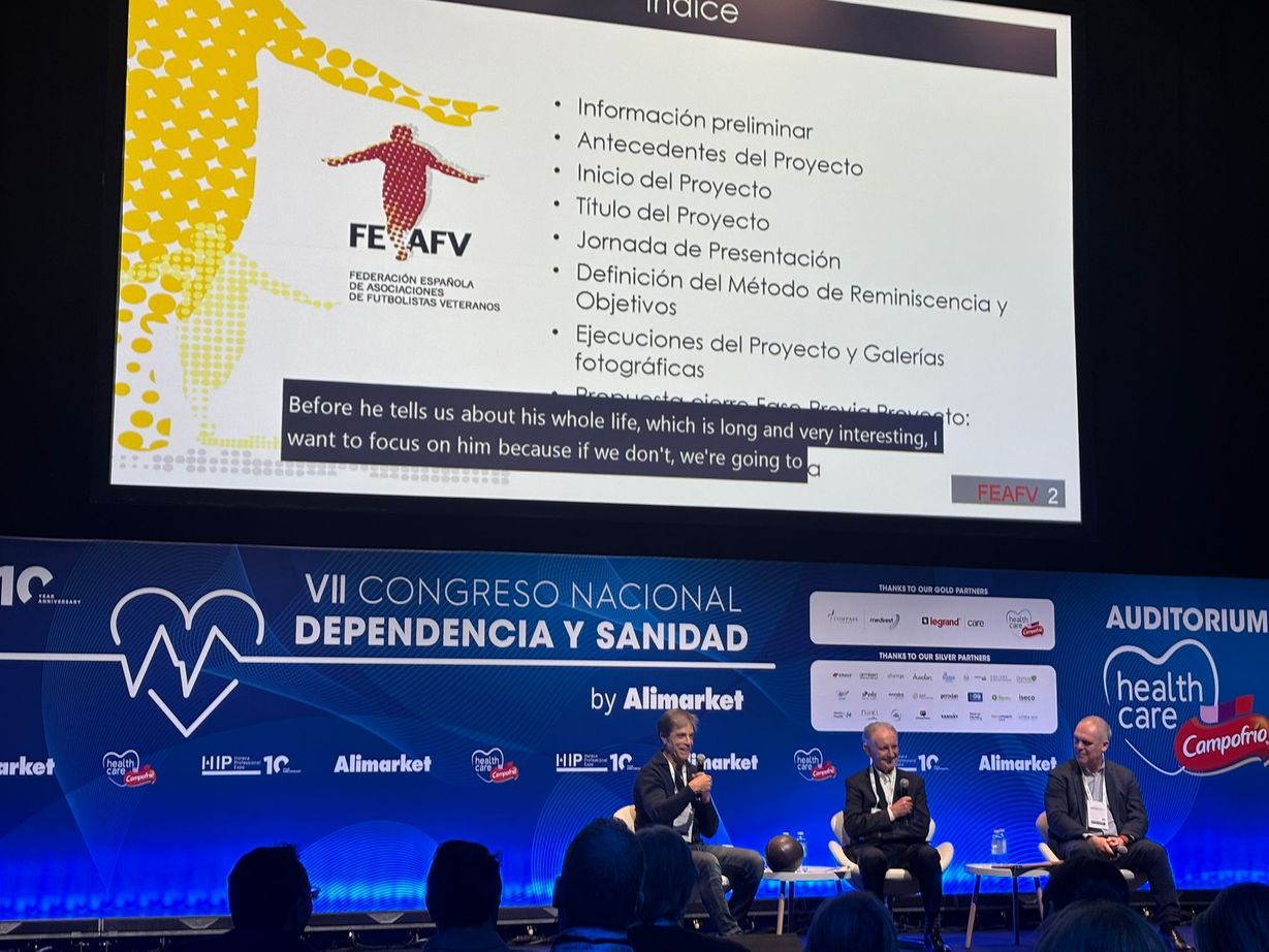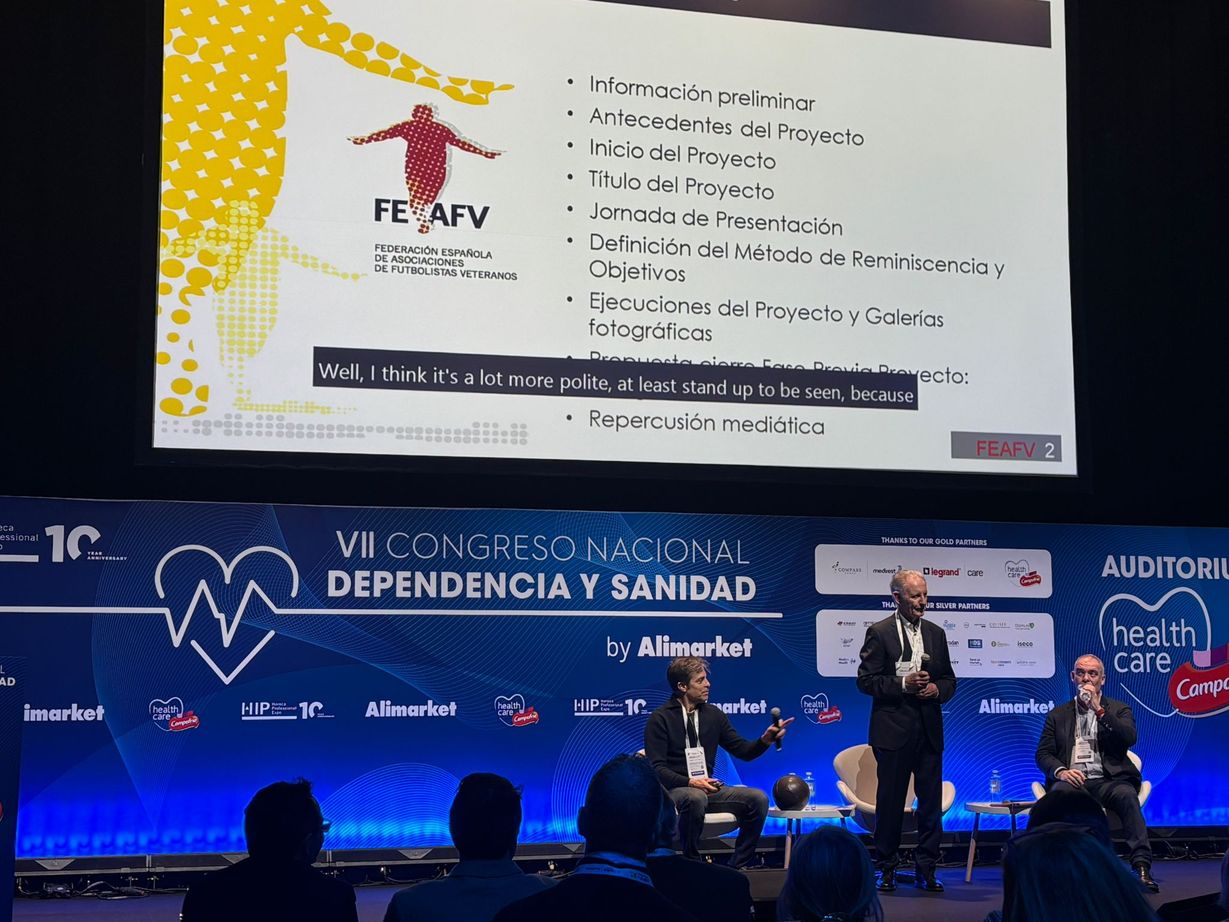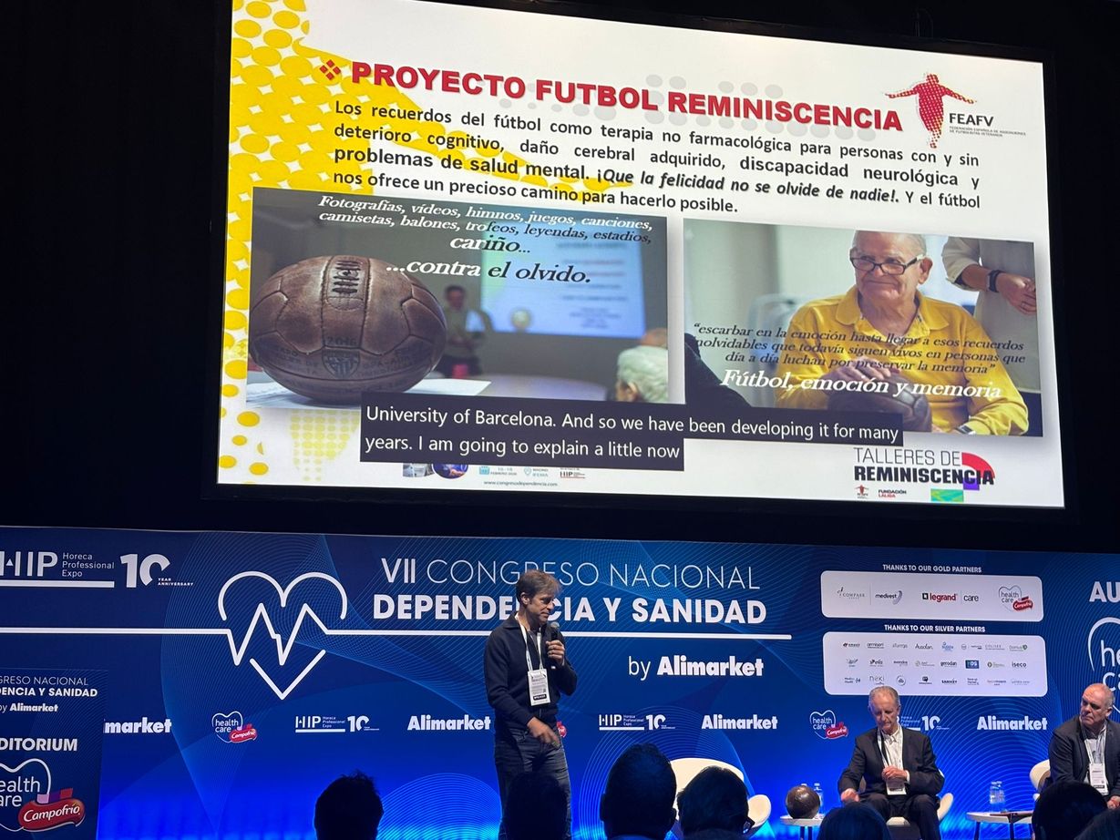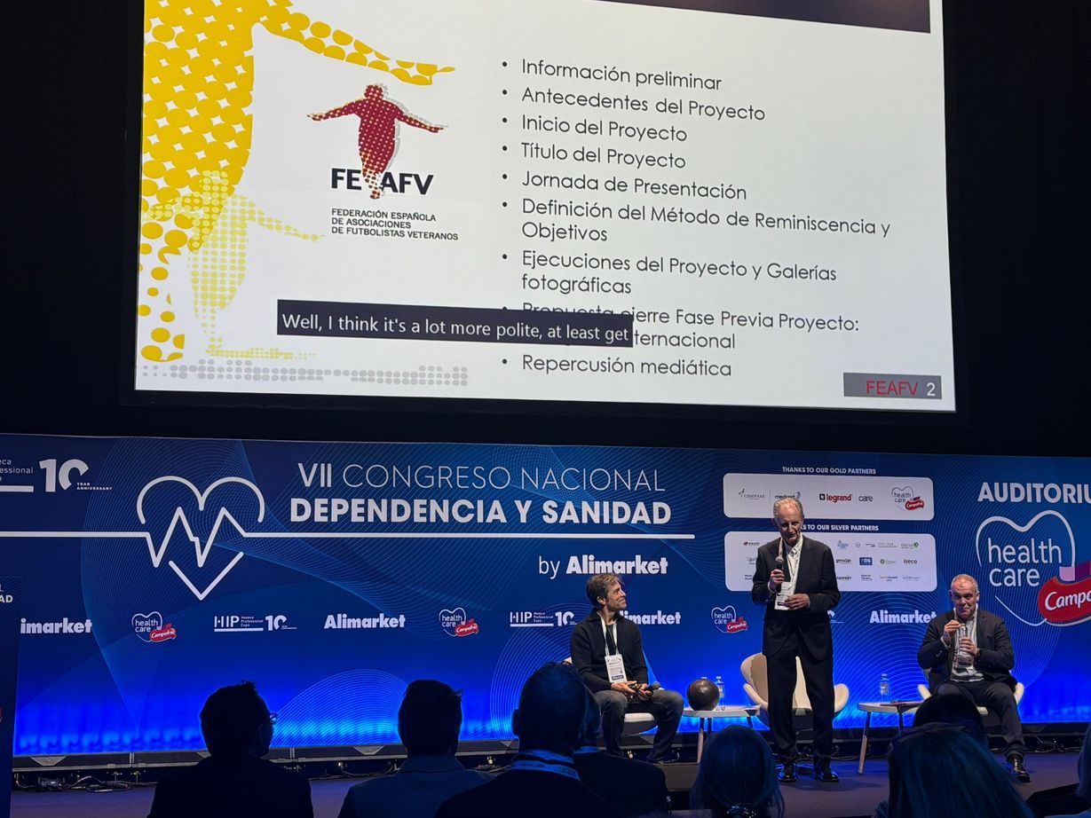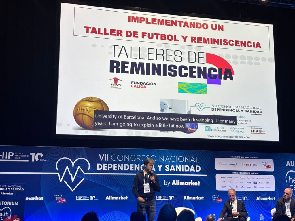 Redacción, 18 de febrero de 2026. El pasado lunes 16 Juan Mari Zorriqueta (Presidente de Honor de la FEAFV), Roberto Solozábal (Presidente de la FEAFV y de la Asociación Leyendas del Atlético de Madrid), José Ezquerra Iribarren (Psicólogo Especialista en Psicología Clínica Coordinador Línea Persona Mayor en FUNDACION HOSPITALARIAS EUSKADI) y Joaquín Anocibar (Responsable Comunicación FEAFV) se desplazaron hasta la Feria de Madrid IFEMA en representación de la Federación Española de Asociaciones de Futbolistas Veteranos invitados al «VII Congreso Nacional Dependencia y Sanidad» a exponer nuestro «Proyecto Fútbol Reminiscencia», una terapia de reminiscencia no farmacológica basada en el fútbol y que llevamos realizando desde el 2013 por toda la geografía española a través de las Asociaciones miembros de la FEAFV con el apoyo y financiación de la FUNDACION LALIGA.