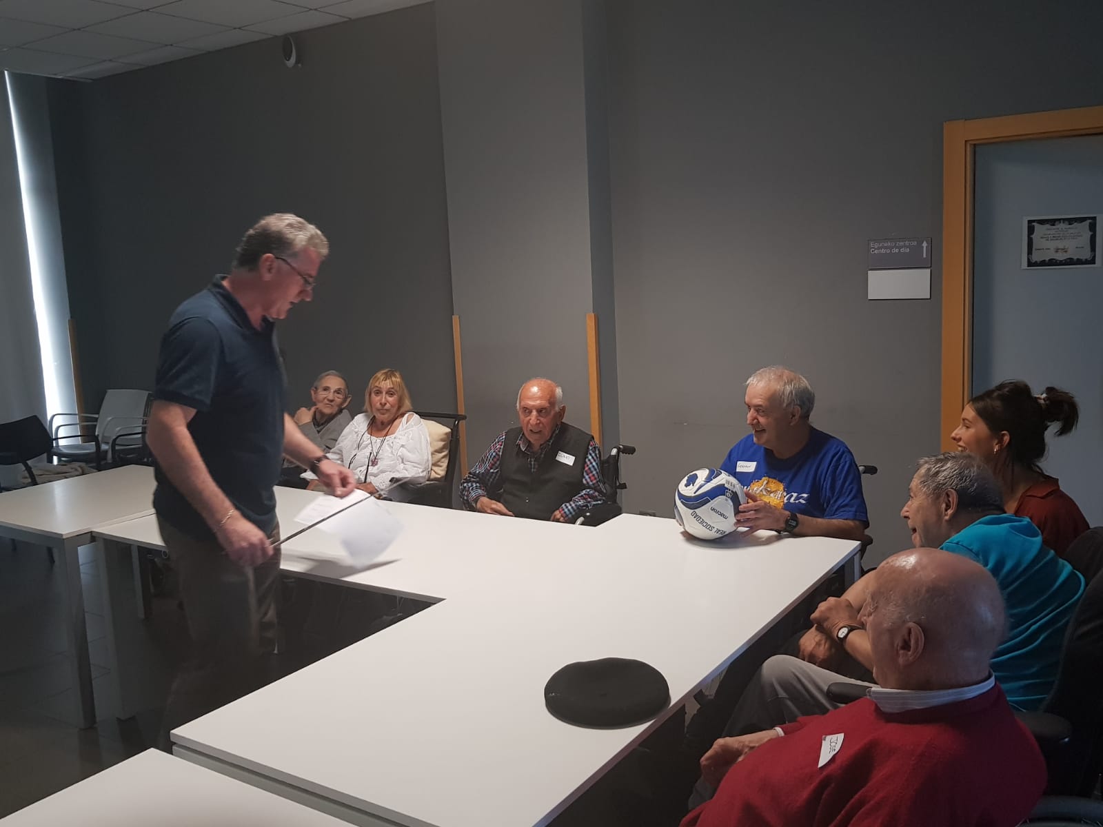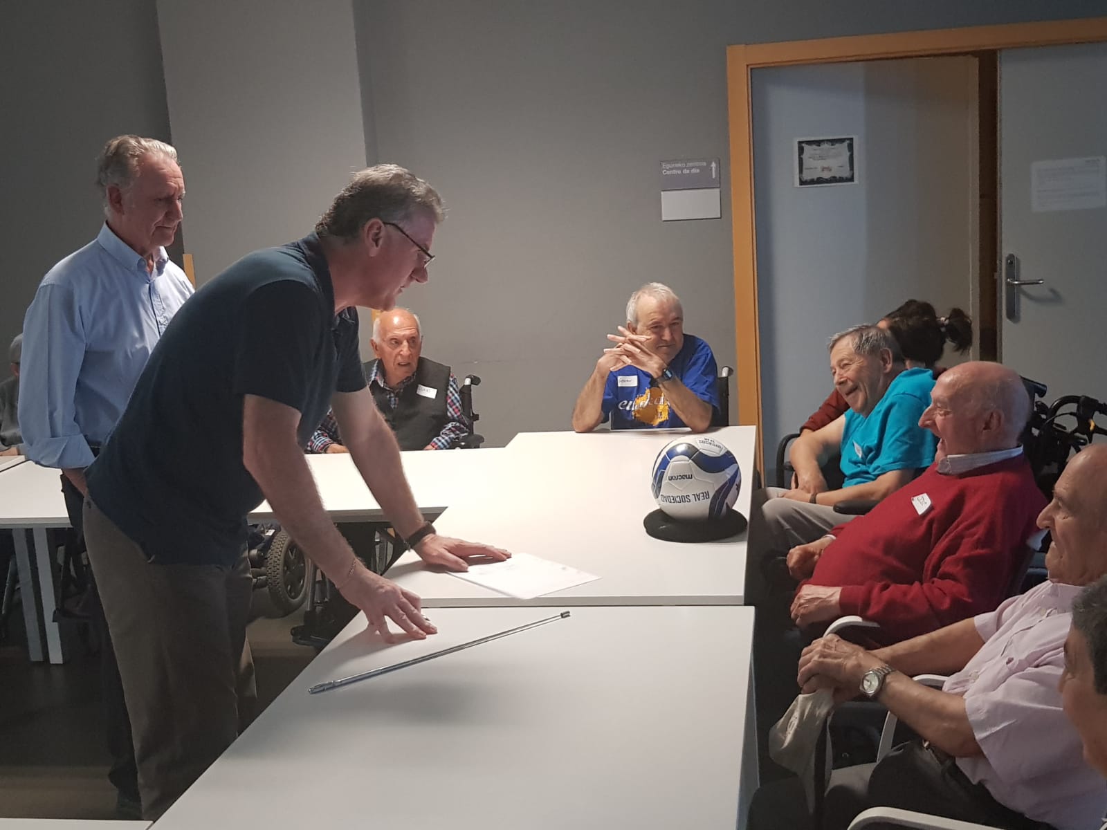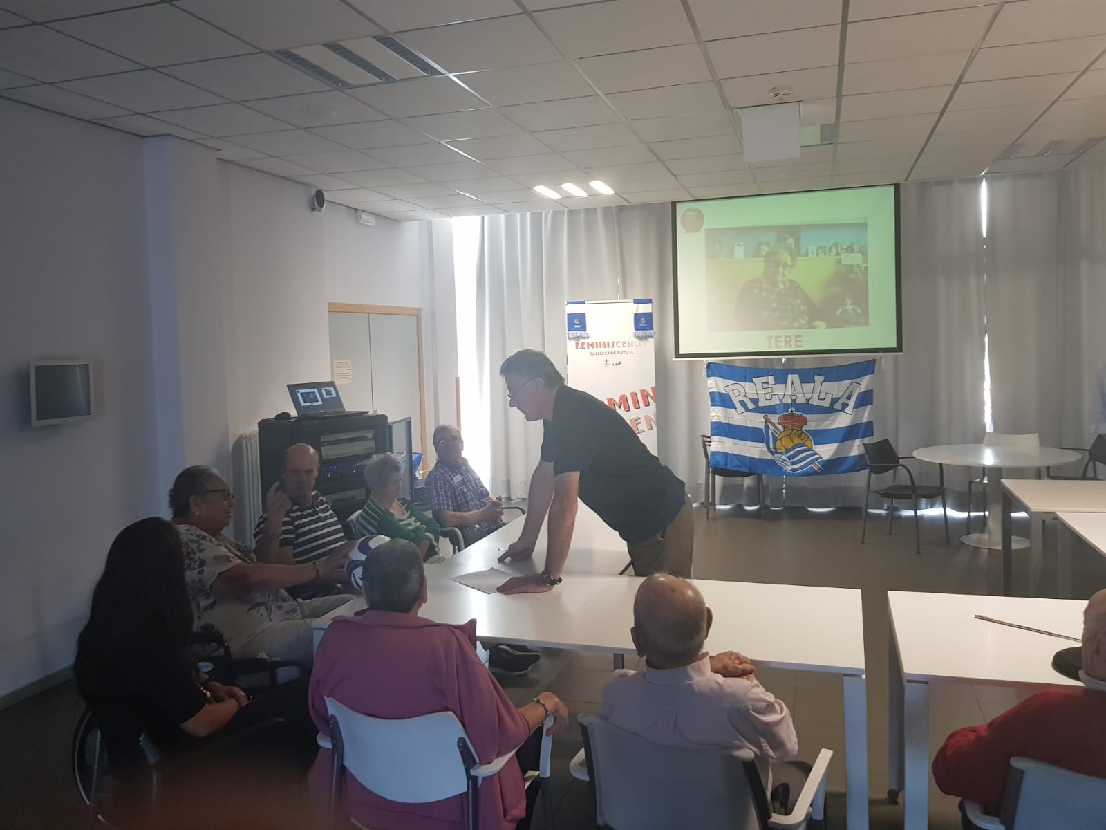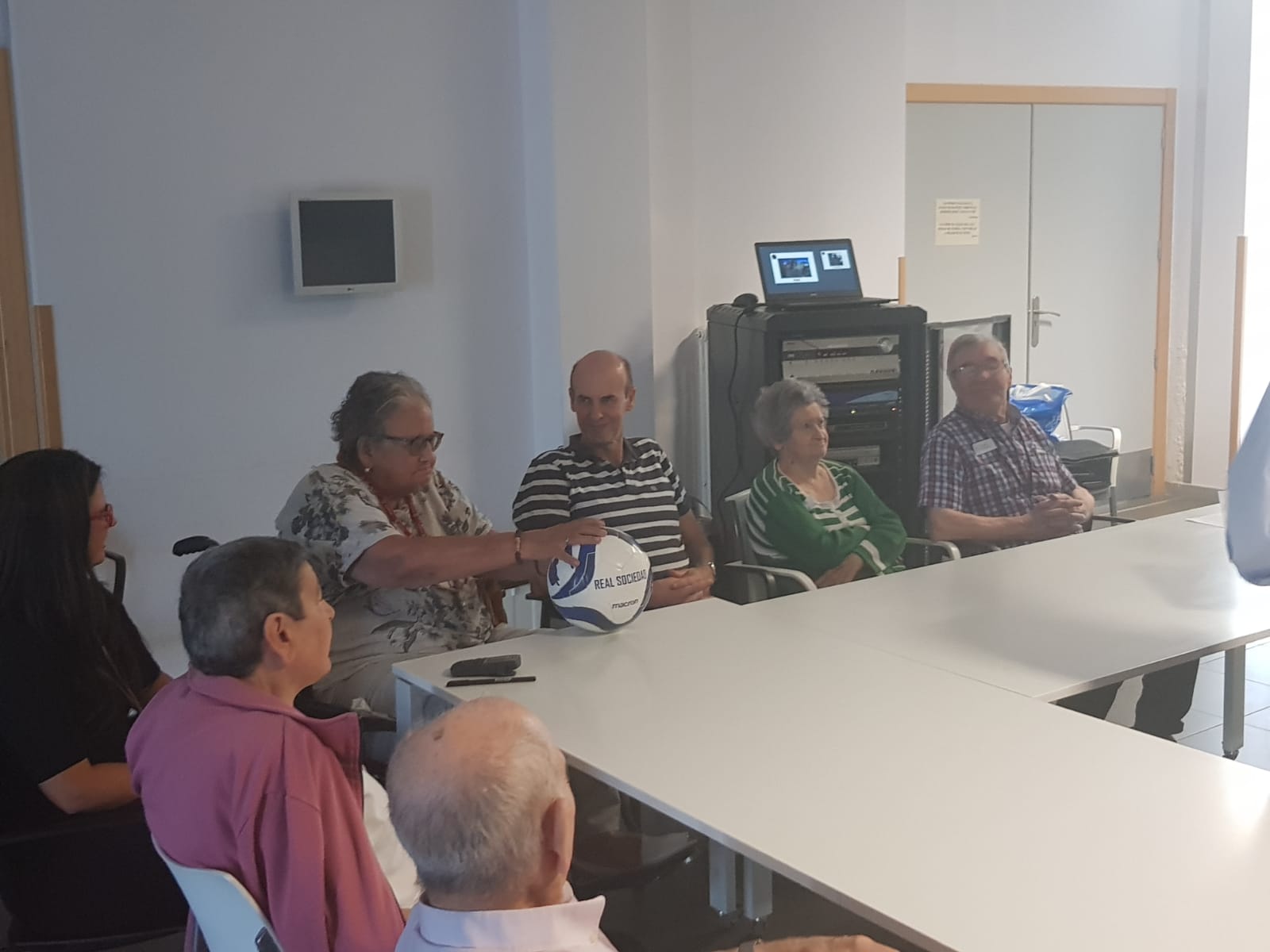 En la sesión inaugural, además de los participantes usuarios de la Residencia, estuvieron presentes Sonia y Marcos (Profesionales del Centro ); Bixio Gorriz (Presidente de la Asociación de Veteranos de la Real Sociedad) , Michel Loinaz, dinamizador del taller y Juan Mari Zorriqueta (Presidente de la Federación Española de Asociaciones de Futbolistas Veteranos – FEAFV).