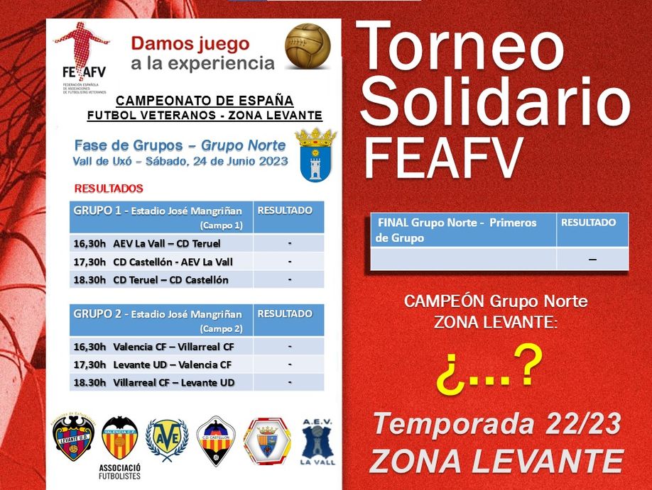 Redacción, 22 de junio de 2023. El próximo sábado 24 de junio la localidad castellonense de la Vall de Uxó acogerá la primera sede del Torneo Solidario FEAFV – Zona Levante. Tras esta primera sede correspondiente al Grupo Norte de la Zona Levante, será la localidad de Cartagena (Murcia) la que acoja el Grupo Sur allá por el mes de septiembre.