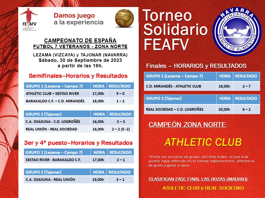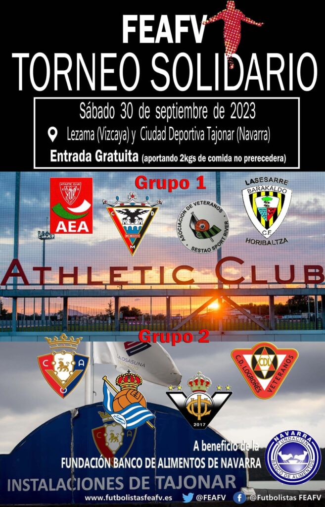 Redacción, 2 de octubre de 2023. Este pasado sábado se disputó el Torneo Solidario FEAFV 2023-Zona Norte. La competición se ha jugado dividida en dos subgrupos, uno en Lezama (Vizcaya), con la participación del Athletic Club de Bilbao, CD Mirandés, Barakaldo CF y Sestao SC; y otro en Tajonar (Navarra), donde se citaron el Real Unión Club de Irun, Club Atlético Osasuna, Real Sociedad de Fútbol y CD Logroñés.