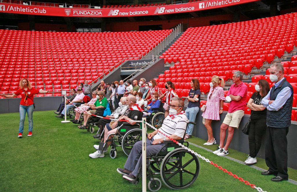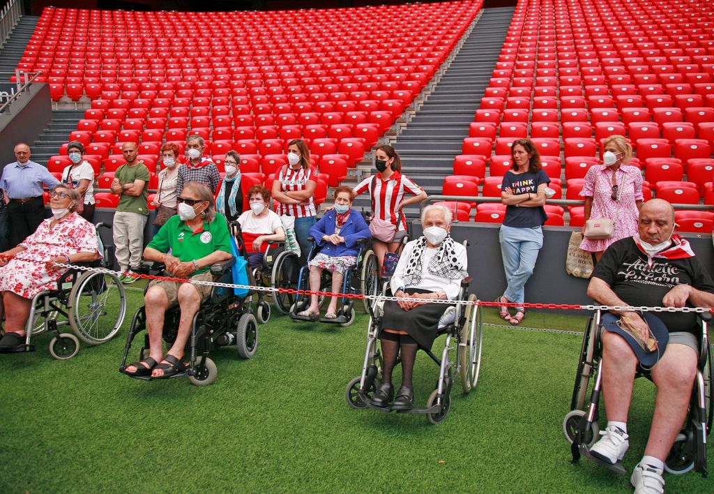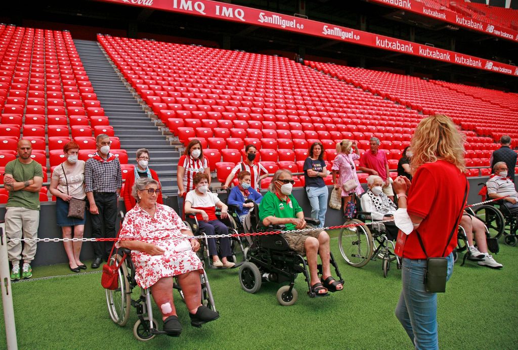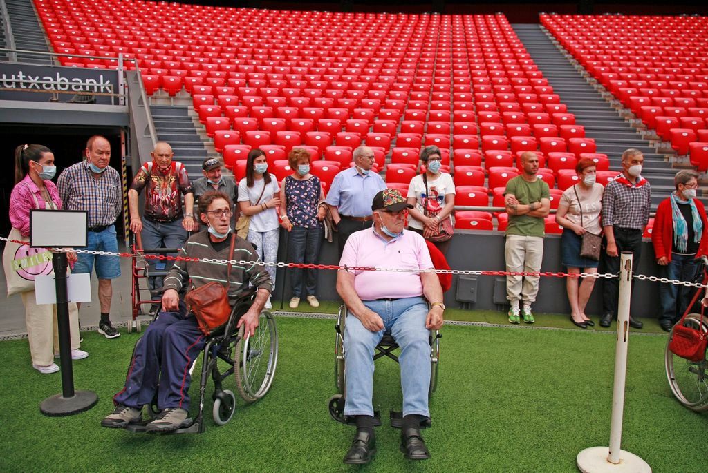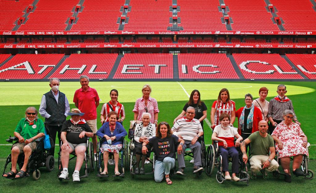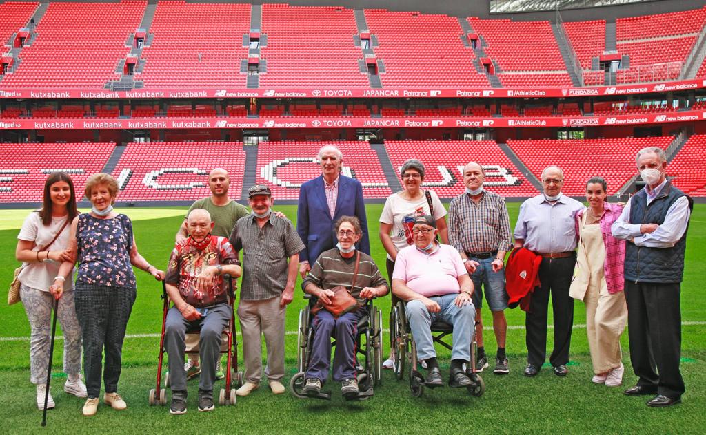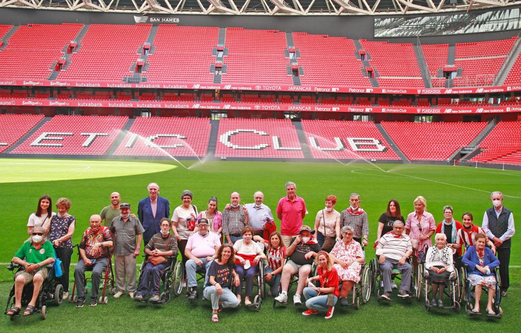 Bilbao, 18 de mayo de 2021. Los participantes del Taller de fútbol y reminiscencia procedentes de las residencias Naguspea Truiuondo de Zamudio y Conde Aresti de Bilbao visitaron este pasado martes, 17 de mayo el feudo del Athletic Club de Bilbao, el Estadio de San Mamés.