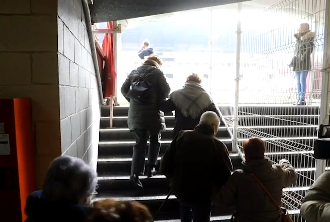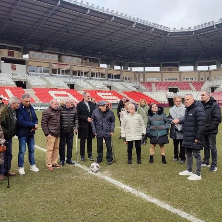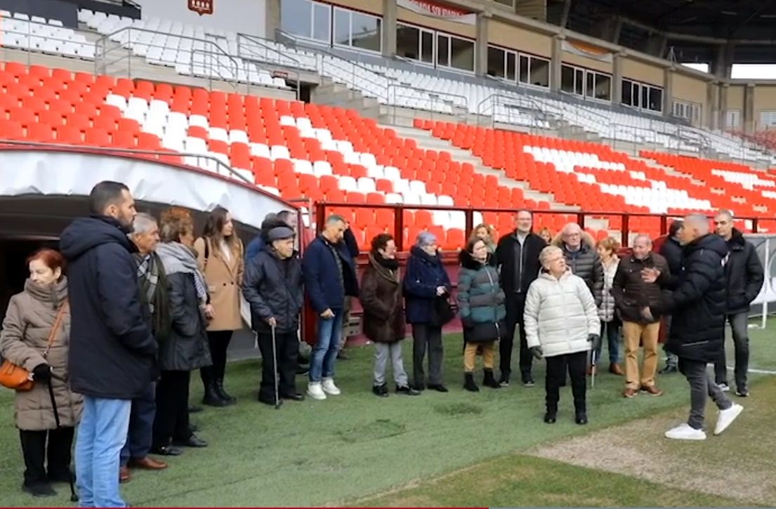 Logroño (La Rioja), 14 febrero 2023. Los participantes del Taller de Reminiscencia basado en el fútbol implementado por los veteranos del CD Logroñés y dirigido a personas con alzhéimer del Centro Manresa de la Asociación Familiares de Enfermos de Alzheimer de La Rioja han visitado este martes el Estadio Municipal Las Gaunas de Logroño.