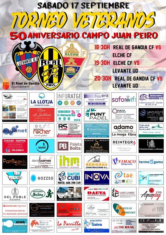 Real de Gandía (Valencia), 20 de septiembre de 2022. El pasado sábado 17 se celebró el Torneo de Veteranos para conmemorar el 50 aniversario del campo fútbol «Juan Peiró» de la localidad valenciana con la participación de los veteranos del Elche CF y Levante UD, que disputaron un triangular junto a los Veteranos del Real de Gandía, organizadores con la inestimable cooperación del Ayuntamiento del Real y de un gran número de empresas colaboradoras.
