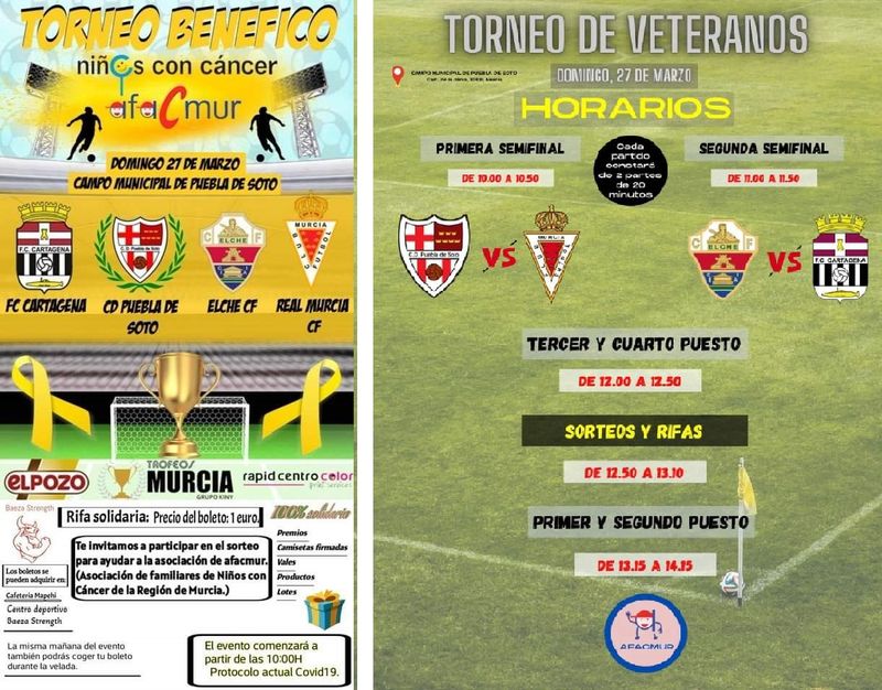 Puebla de Soto (Murcia), 29 de marzo de 2022. El pasado domingo, en el Campo Municipal de Puebla de Soto, tuvo lugar un torneo de fútbol de veteranos benéfico en favor de la asociación AFACMUR (Asociación de Familiares de Niños con Cáncer de la Región de Murcia) con la presencia y colaboración de las Asociaciones de exjugadores del Real Murcia CF, Elche CF y FC Cartagena.
