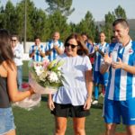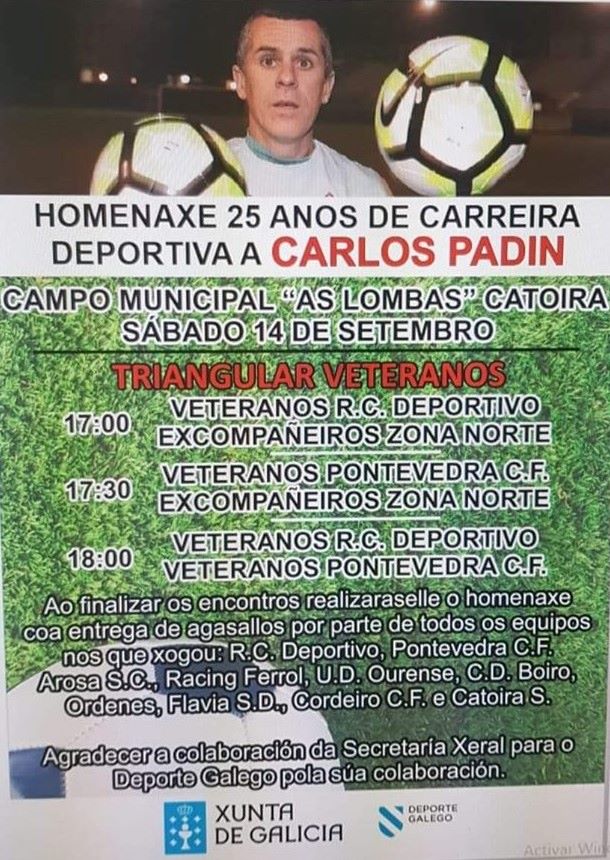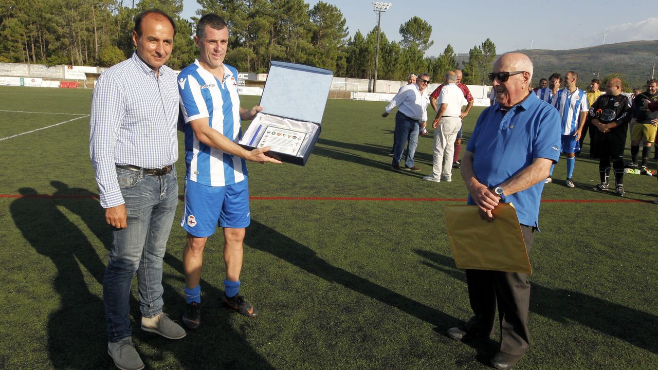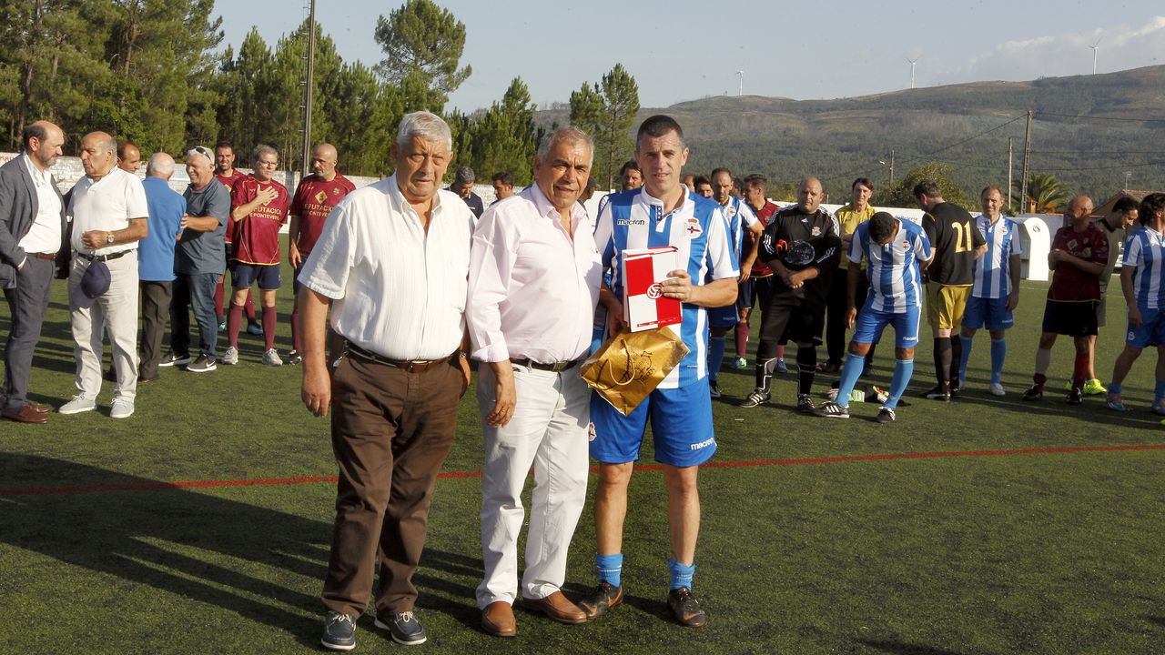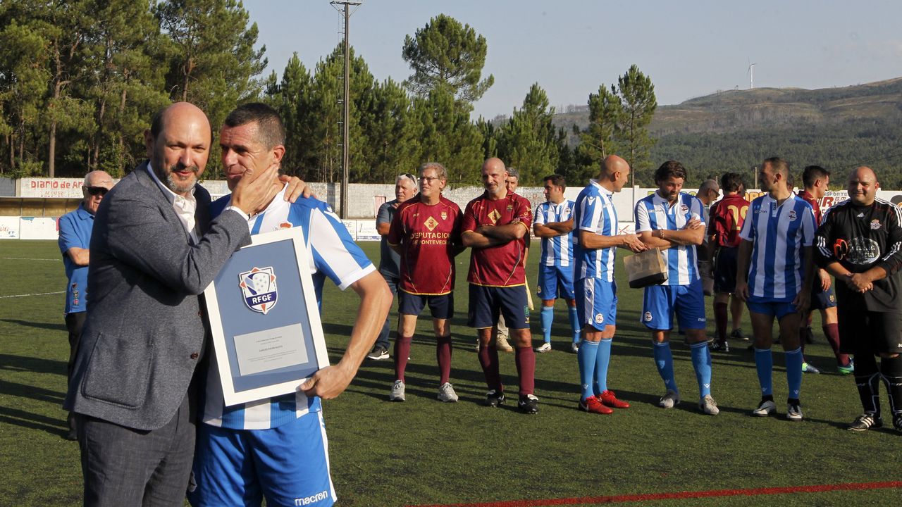 Catoira (Pontevedra), 15 de septiembre de 2019. El fútbol gallego rindió homenaje el pasado sábado al exdeportivista Carlos Padín con un triangular de futbol 7 en el que se enfrentaron los equipos Veteranos del Deportivo de La Coruña, de los que Padín forma parte, Pontevedra y una selección de excompañeros del catoirense.