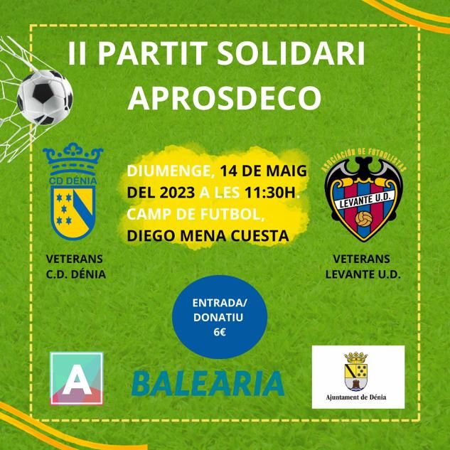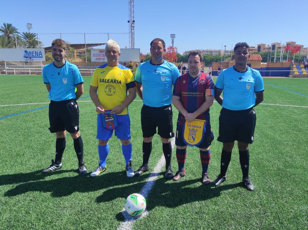 Denia (Valencia), 16 de mayo de 2023. El Estadio Diego Mena de la localidad valenciana de Denia albergó el pasado domingo un partido de fútbol solidario entre los veteranos del C. D. Dénia y los veteranos del Levante U. D., en favor de la Asociación APROSDECO.