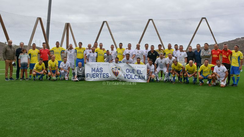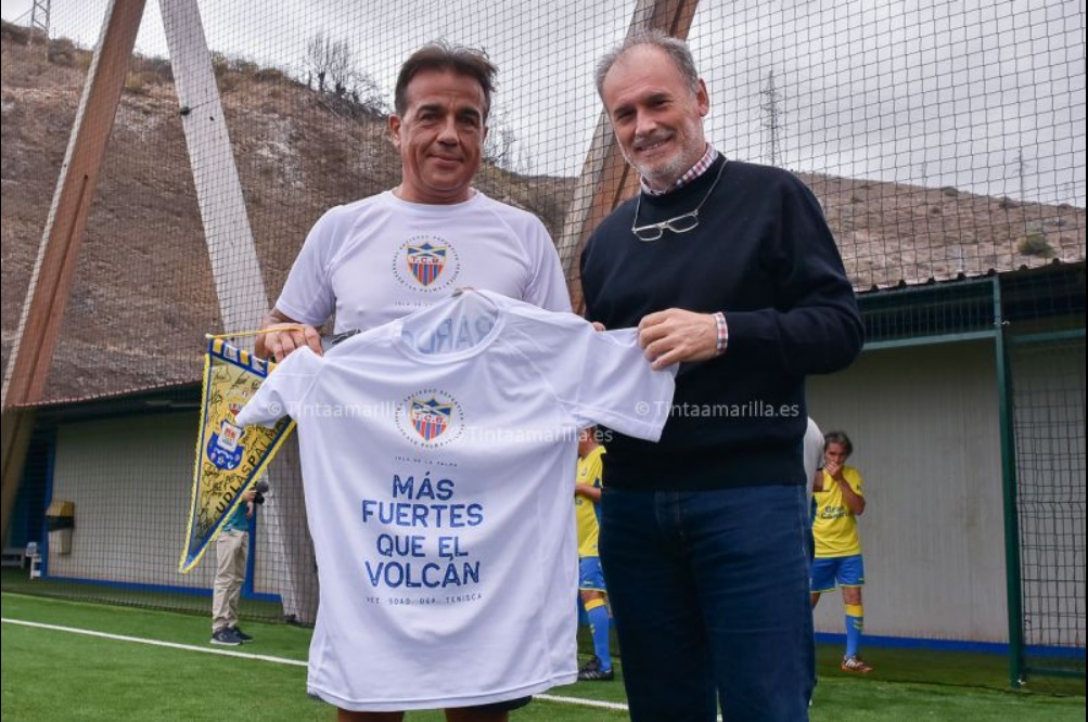 Las Palmas de Gran Canaria, 9 de noviembre de 2021. Bajo los lemas “La Unión Hace La Palma” y “Más fuertes que el volcán”, los equipos de veteranos de la UD Las Palmas y el S.D. Tenisca tuvieron una jornada de convivencia mostrando su la isla de , que está sufriendo las “embestidas” del volcán de Cumbre Vieja.