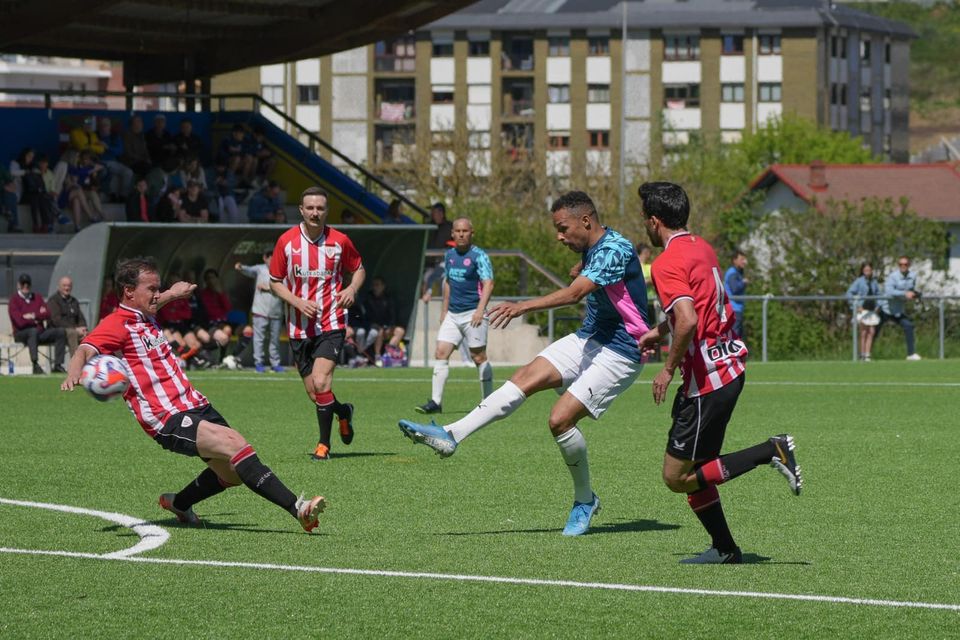 Sopelana (Vizcaya), 24 de abril de 2024. Los equipos de la Asociacion de Exjugadores del Athletic Club de Bilbao y de la Selección AFE Veteranos disputaron un partido de carácter benéfico en el Polideportivo Urko de la localidad de Sopelana con el fin de recaudar fondos para la Asociación de Enfermedades Raras Euskadi EBH (ASEBIER).