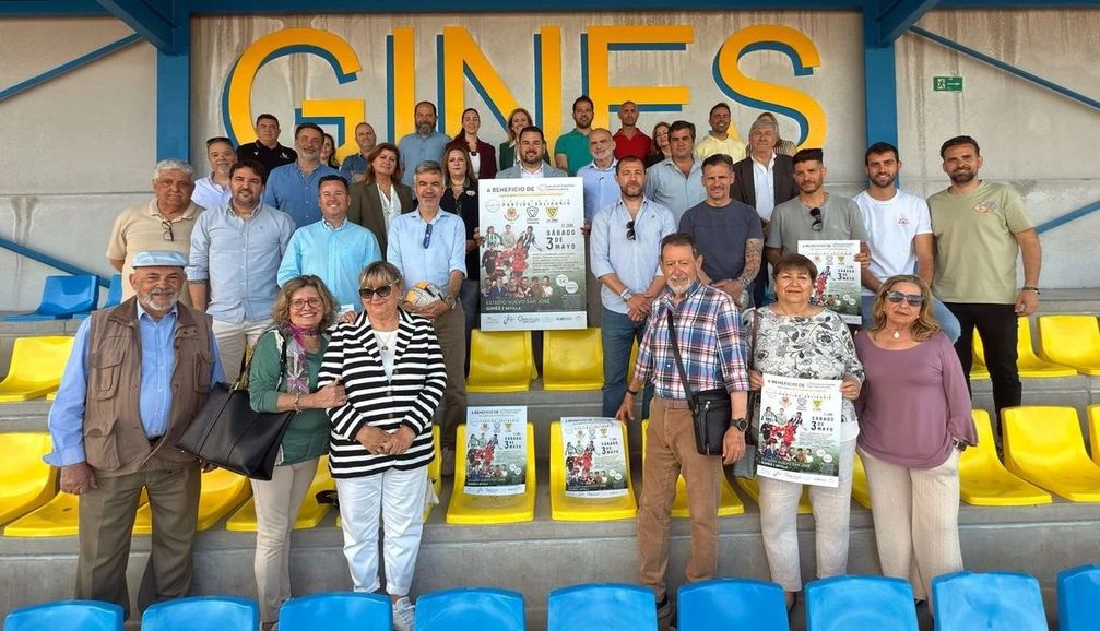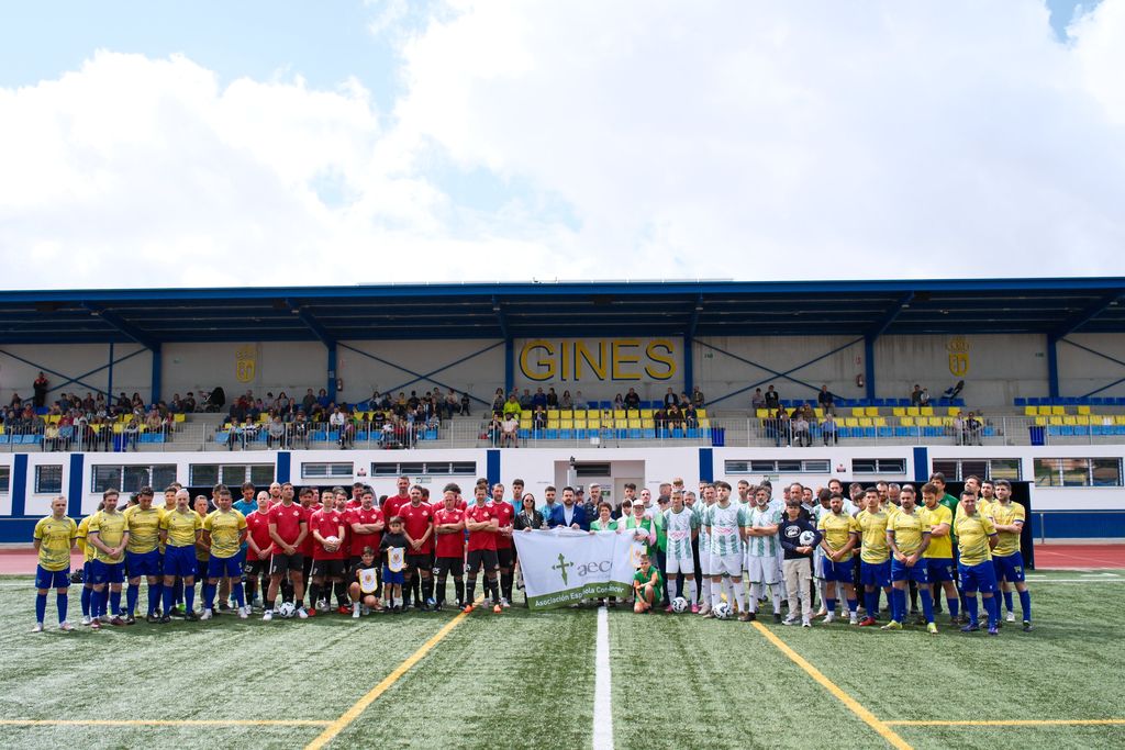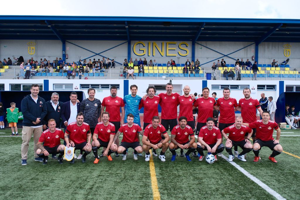 Gines (Sevilla), 5 de mayo de 2025. En medio de un gran ambiente, el pasado sábado se celebraba en el Estadio Nuevo San José de Gines un atractivo torneo triangular solidario de fútbol de veteranos con muchos rostros conocidos. Una iniciativa organizada por el Ayuntamiento de la localidad con el objetivo de recaudar fondos para la Asociación Española contra el Cáncer (AECC).