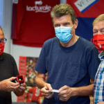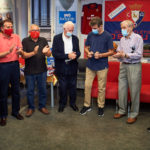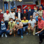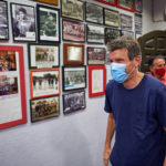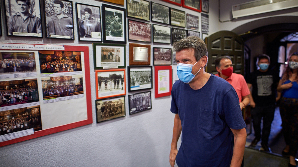 Pamplona (Navarra), 3 de septiembre de 2020. La A. D. Osasuna Veteranos efectuó un acto en su sede de la Plaza del Castillo en el que impusieron la insignia de oro y nombraron socio honorífico a Juan Carlos Unzué, pamplonés, ex portero y ex entrenador del Atletico Osasuna, que el pasado 18 de junio de 2020, anunció por sorpresa en rueda de prensa que dejaba el mundo del fútbol para centrarse en su familia, debido a que le fue diagnosticada la enfermedad de Esclerosis lateral amiotrófica (ELA).