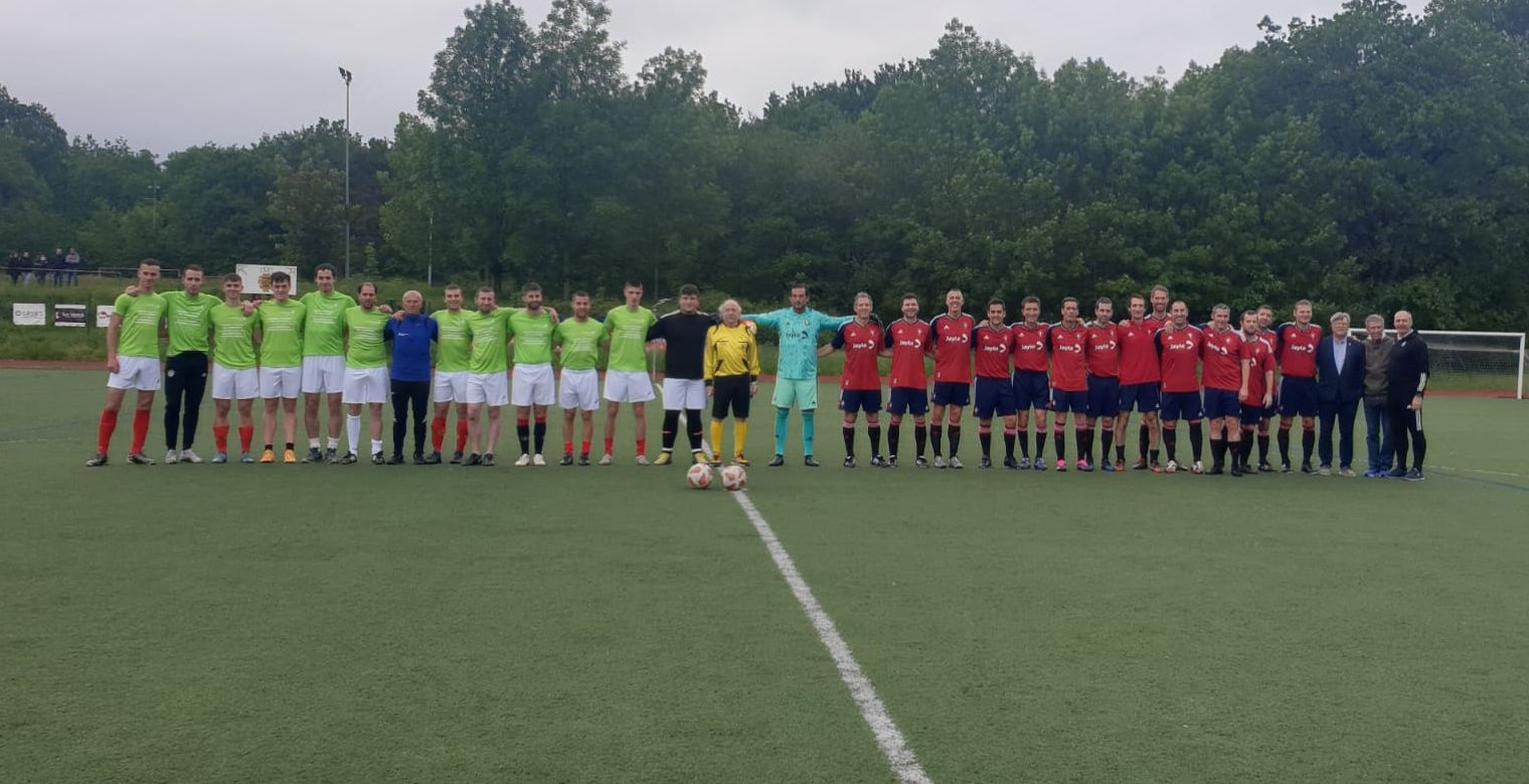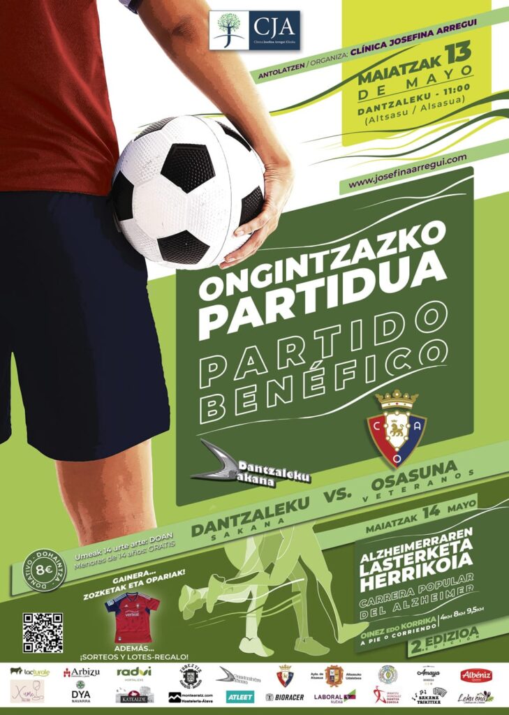 Alsasua (Navarra), 15 de mayo de 2023. Entre las actividades organizadas por la Fundación Clínica Josefina Arregui con el objetivo de visibilizar el Alzheimer y fomentar la práctica deportiva y los hábitos saludables entre la población, en esta nueva edición se disputó el pasado sábado un partido benéfico entre Osasuna Veteranos y una selección de del club de Atletismo Dantzaleku Sakana de la localidad.