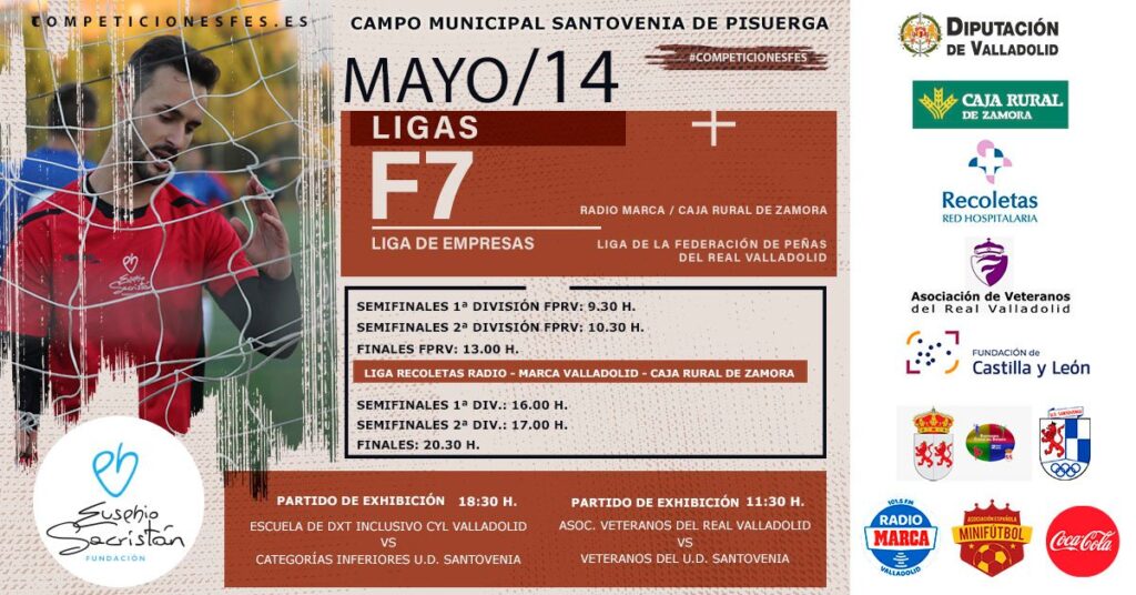 Santovenia de Pisuerga (Valladolid), 17 de mayo de 2023. La localidad vallisoletana de Santovenia de Pisuerga fue el pasado domingo la capital del fútbol amateur de la provincia de Valladolid. En juego estuvieron las finales de las ligas de fútbol inclusivo de la Fundación Eusebio Sacristán (FES) , así como las competiciones sociales de la Federación de Peñas Del Real Valladolid, competiciones impulsadas por Caja Rural de Zamora y Radio Marca Valladolid .