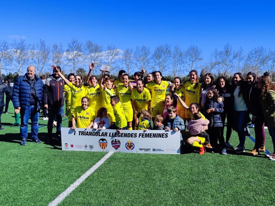 Alaquàs (Valencia), 12 de marzo de 2024. Finalizó con éxito y victoria del Villarreal el “I Triangular Femenino de Leyendas”. Organizado por la Asociación de Futbolistas del Valencia CF, en su ánimo por reconocer el esfuerzo y dar mayor visibilidad al Valencia CF femenino en particular y al deporte femenino en general, el I Triangular ‘Llegendes Femenines de la Comunitat Valenciana’, el primero que se realiza siendo protagonistas las exjugadoras más importantes de los equipos más aclamados del territorio valenciano, cayó del lado del Villarreal CF.