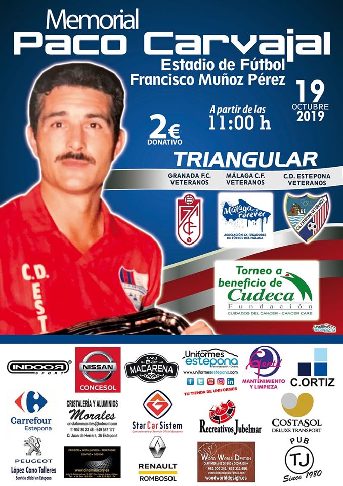 El “IV Memorial Paco Carvajal” se celebró en formato de triangular solidario en el Estadio de Fútbol Francisco Muñoz Pérez para ayudar a la Fundación Cudeca – Cuidados del Cáncer. La entrada solidaria fue de 2€ por persona y se destinó íntegramente a dicha fundación.