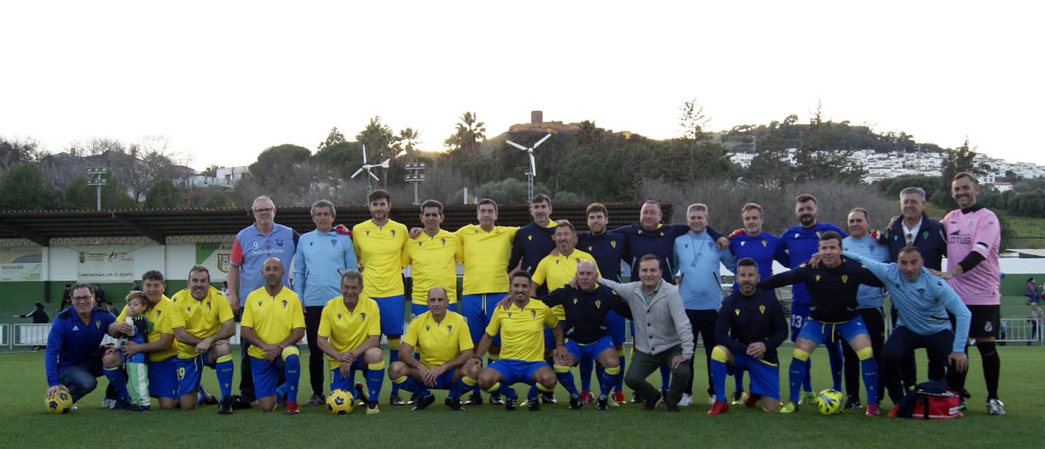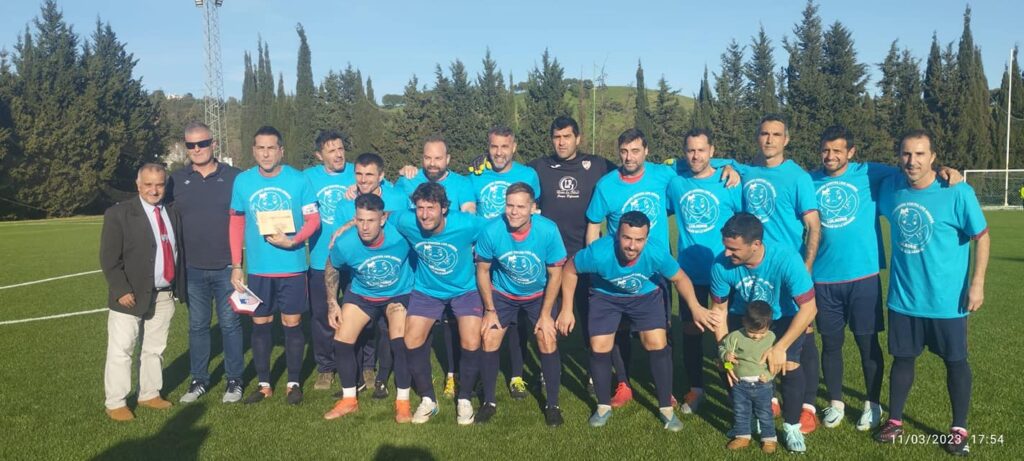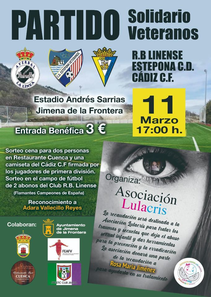 Jimena de la Frontera (Cádiz), 13 de marzo de 2023. Los veteranos de Real Balompédica Linense, CD Estepona y Cádiz Club de Fútbol disputaron el pasado sábado a partir de las 17:00 un triangular solidario en el campo de fútbol «Andrés Sarria» de Jimena de la Frontera con el objetivo de recaudar fondos para la Asociación Lulacris, cuya finalidad es ayudar a las personas que han sufrido acoso sexual durante su infancia. La recaudación también irá destinada a Adara Vallecillo y Rosa María Jiménez, dos vecinas de la localidad con graves problemas de salud.