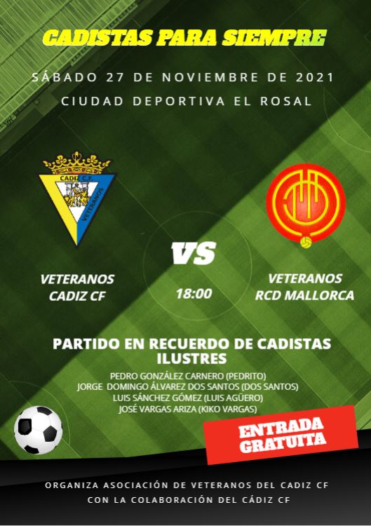 Cádiz, 27 de noviembre de 2021. El pasado sábado se disputó en la Ciudad deportiva «El Rosal» un partido amistoso entre los veteranos del Cádiz CF y los del RCD Mallorca para recordar a unos cadistas ilustres que, por desgracia, nos dejaron hace poco, como son el caso de Pedro González Carnero (Pedrito), Jorge Domingo Álvarez Dos Santos (Dos Santos), Luis Sánchez Gómez (Luis Agüero) y José Vargas Ariza (Kiko Vargas).