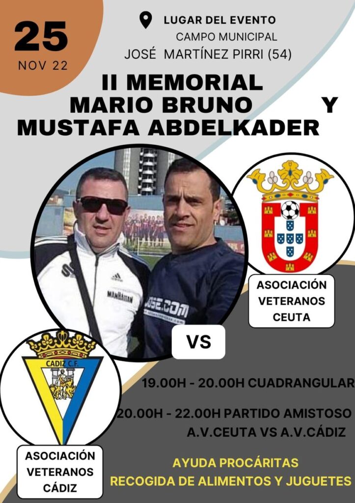 Ceuta (Ciudad Autónoma), 30 de noviembre de 2022. El equipo de la Asociación de Veteranos del Cádiz CF cruzó el pasado viernes el estrecho de Gibraltar para celebrar y disputar el II Memorial ‘Mariano Bruno y Mustafa Abdelkader’ organizado por los Veteranos de Fútbol de Ceuta para recordar a dos de los que fueron sus integrantes y que dejaron huella entre sus compañeros. El partido homenaje midió a ambos equipos en el campo de fútbol José Martínez ‘Pirri’.