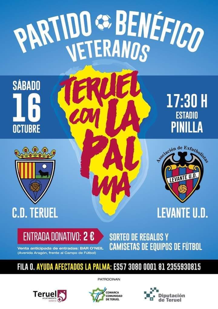Para ayudar a los damnificados por la erupción, con el lema ‘Teruel con La Palma’, los veteranos del CD Teruel y del Levante UD unieron sus fuerzas y ofrecieron espectáculo futbolístico y solidario en el Complejo Deportivo Pinilla. La entrada tuvo un precio simbólico de dos euros, que se pudo completar con la cantidad que cada espectador considerase oportuna, o con una aportación a la Fila 0 a través de una cuenta bancaria dispuesta para la ocasión.