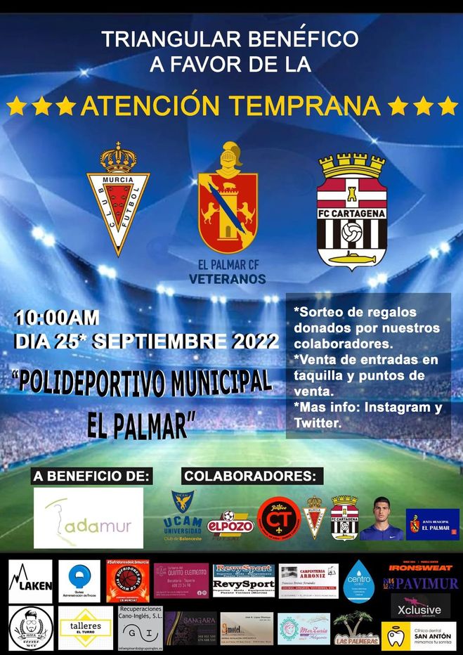 El Palmar (Murcia), 29 de septiembre de 2022. El pasado domingo, los equipos de Veteranos del F.C. Cartagena y del Real Murcia CF acudían a la localidad murciana de El Palmar para disputar un Torneo Benéfico organizado por los veteranos de El Palmar CF a favor de Adamur (Centro de Desarrollo Infantil y Atención Temprana formado por un equipo interdisciplinar de psicólogos, psicopedagogos, pedagogos, logopedas y fisioterapeutas que atienden a niños de todas las edades y a sus familias de la Región de Murcia.)