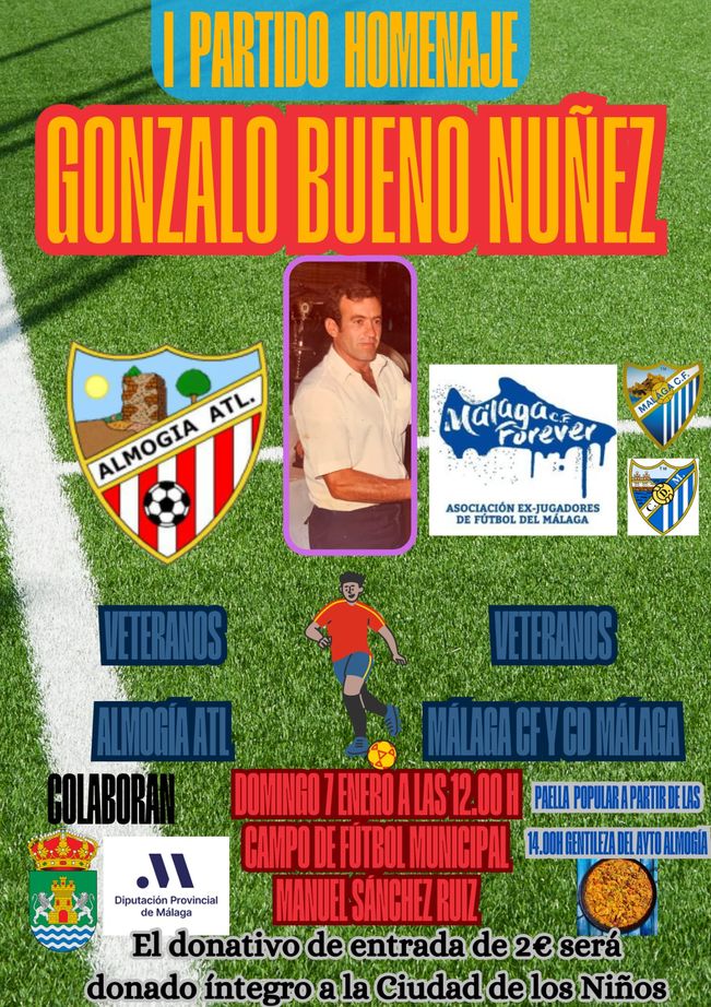 Almogía (Málaga), 10 de enero de 2024. El pasado día 7 de enero se pudo disfrutar de un partido benéfico homenaje a D. Gonzalo Bueno Núñez, que fue presidente y entrenador del Almogía Atletic siempre trabajador y entregado a su equipo.