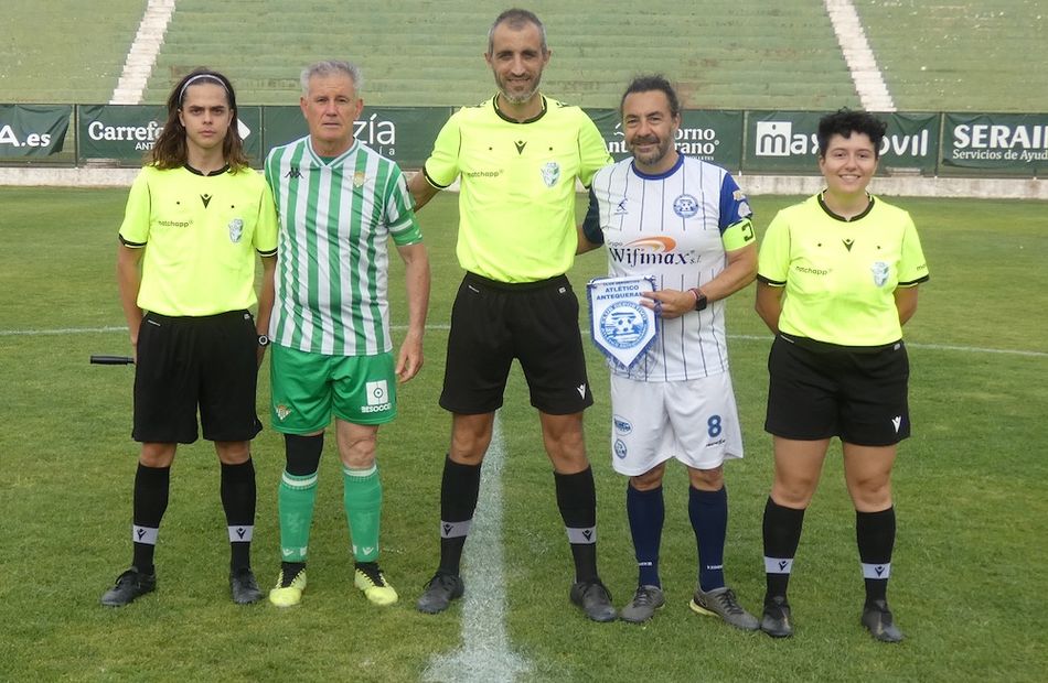 Antequera (Málaga), 23 de mayo de 2022. El pasado sábado los equipos de veteranos de la Asociación de ExJugadores del Real Betis Balompié y del Málaga C.F. acudieron al estadio El Maulí de Antequera para disputar un triangular benéfico ante el equipo local veteranos del Club Deportivo Atlético Antequerano.