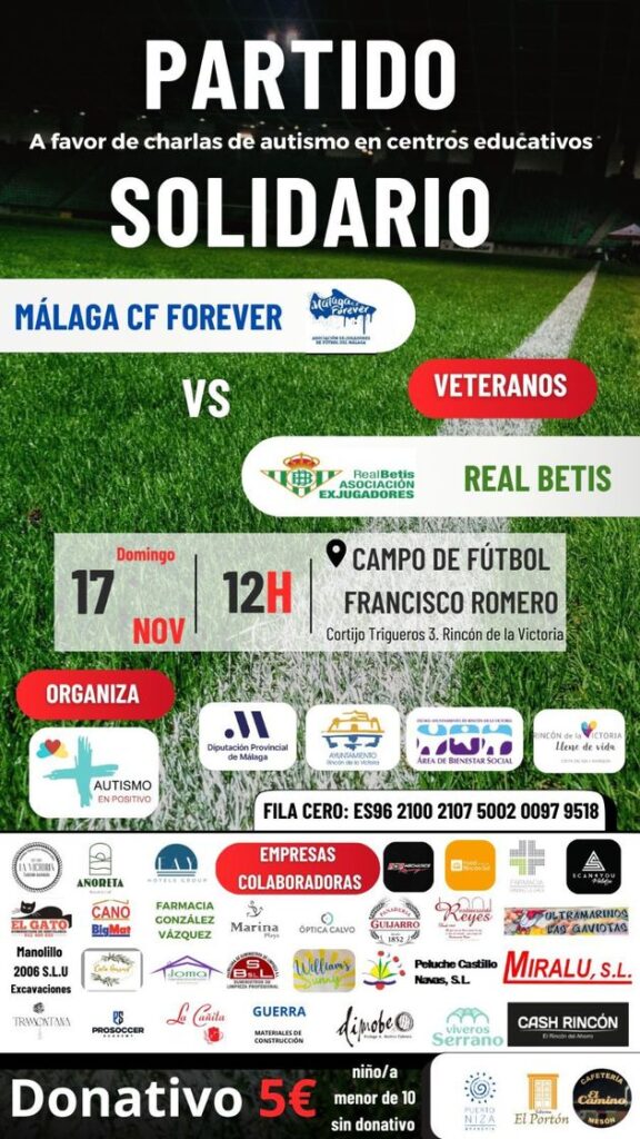 El Rincón de la Victoria (Málaga), 20 de noviembre de 2024. La localidad malagueña de El Rincón de la Victoria acogió el pasado Domingo 17 de Noviembre el partido solidario entre veteranos del Málaga C.F. Forever y el Real Betis. La jornada fue organizada por la Asociación Socio-Cultural Autismo en Positivo y con la colaboración de las Concejalías de Bienestar Social y Turismo del Ayuntamiento de la localidad. El objetivo, recaudar fondos para seguir dando charlas informativas que imparte Autismo en Positivo en los centros educativos de Primaria y Secundaria en el municipio y la provincia.