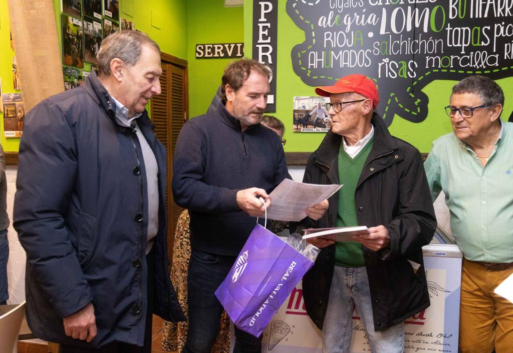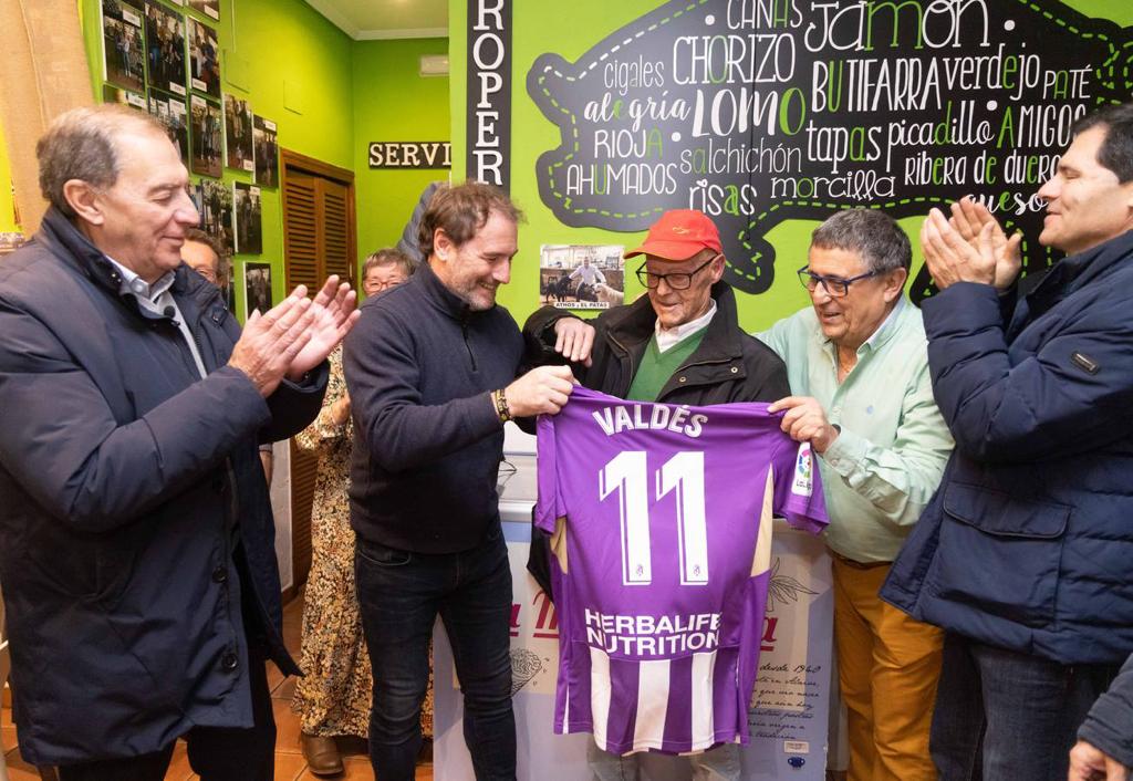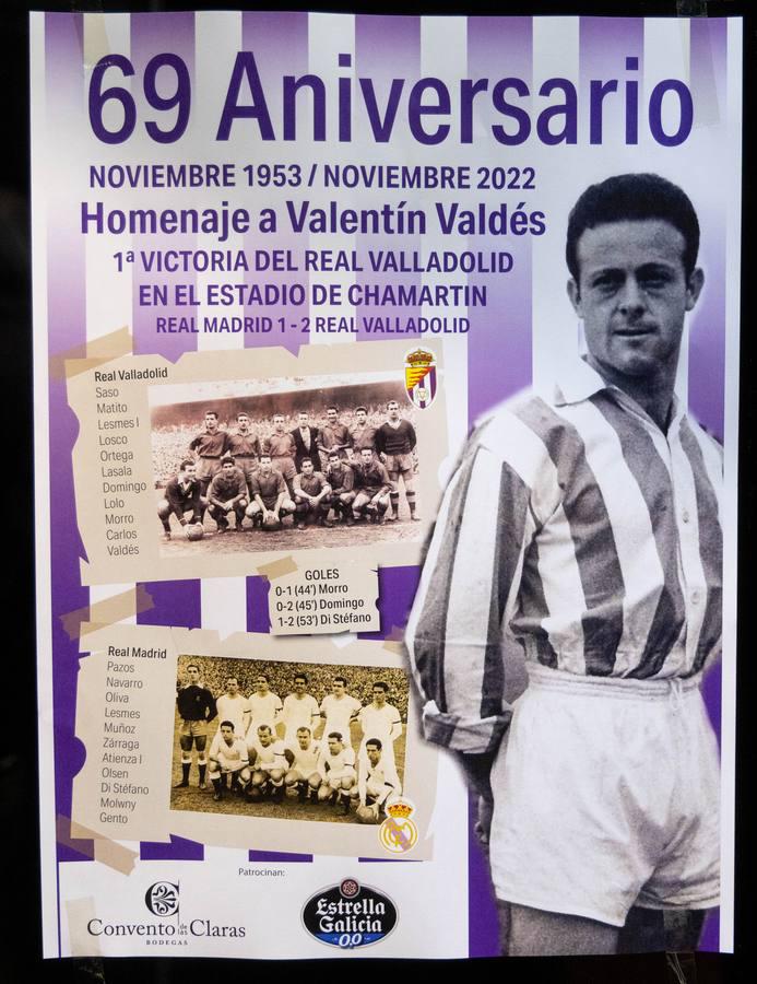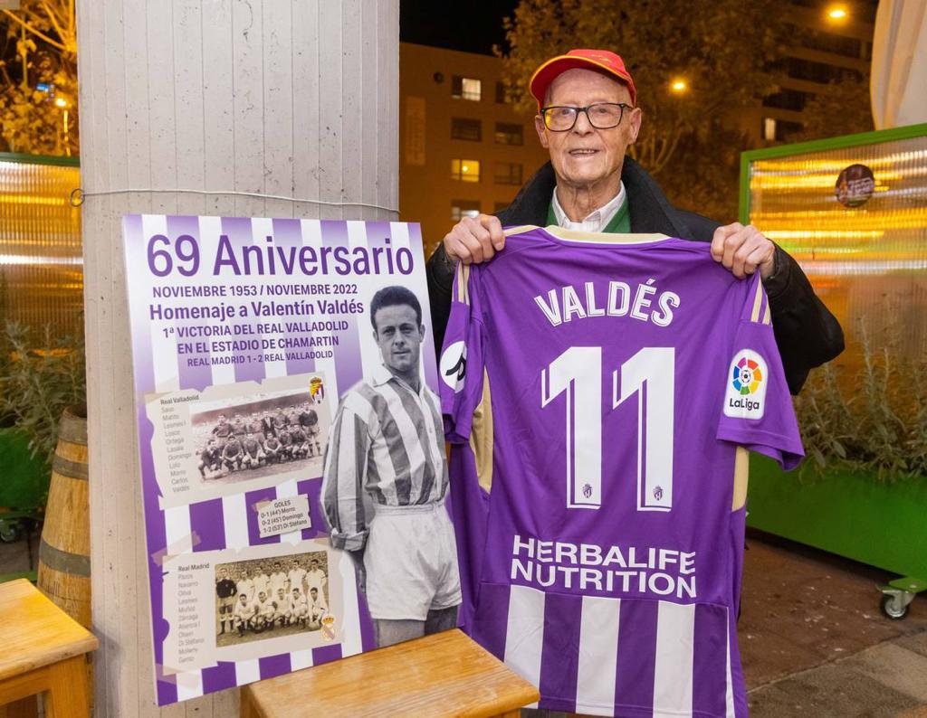 Valladolid, 29 de noviembre de 2022. En un sencillo acto organizado por Alfonso Losco en el local Can Patas del Parque Alameda de Valladolid, la Asociación de Veteranos del Real Valladolis homenajeó al asturiano Valentín Valdés «Fiú», que a sus 93 años, es el único superviviente de la primera victoria del Pucela en campo del Real Madrid, hace 69 años.