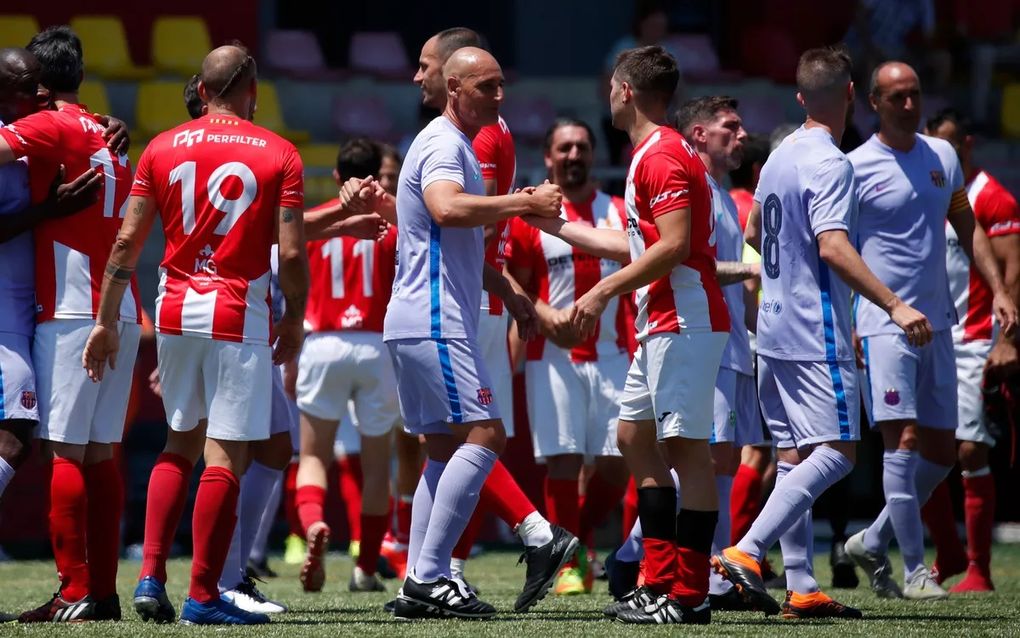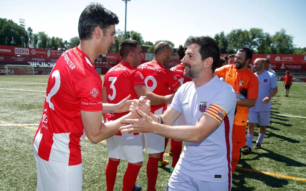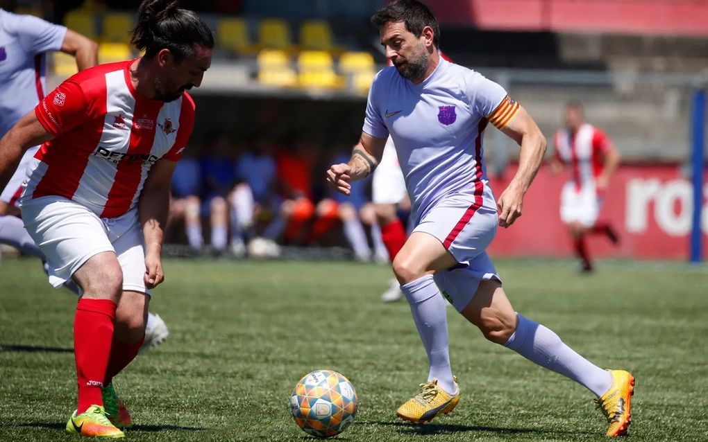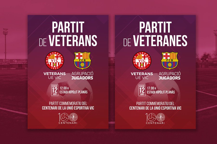 Vic (Barcelona), 12 de junio de 2022. El estadio Hipòlit Planàs fue el escenario para conmemorar el centenario de la UE Vic y rendir homenaje al exblaugrana Joan Toll, motivo por el que los equipos masculino y femenino de la Agrupación de Jugadores del FC Barcelona se trasladaron a la capital de Osona para jugar un doble partido conmemorativo.