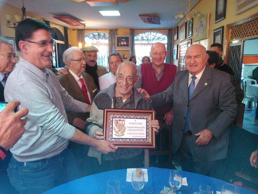Sevilla, 20 de Diciembre de 2013. Coincidiendo con la comida anual de los veteranos del Sevilla F.C., la agrupación hispalense rindió un merecido homenaje al que fuera popular masajista de toda la vida del Sevilla, Manolito Pérez.