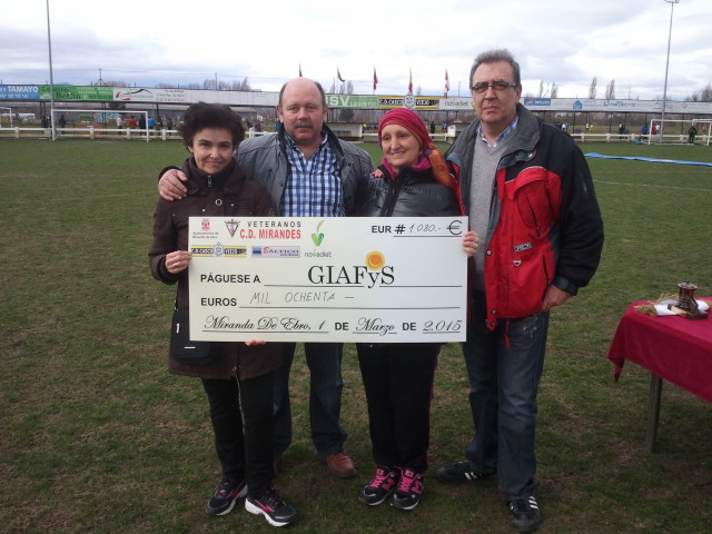 Miranda de Ebro, 1 de marzo de 2015. Tras la presentación realizada el 24 de febrero en las instalaciones deportivas del CD Casco Viejo, la localidad de Miranda de Ebro acogió el estreno de la Liga Solidaria FEAFV Zona Norte-Grupo A, a beneficio de la Fundación GIAFyS Cáncer, que recibió el cheque de la recaudación a la conclusión del evento (ver galería fotográfica).