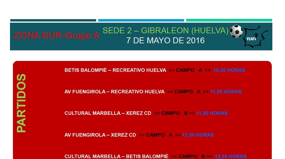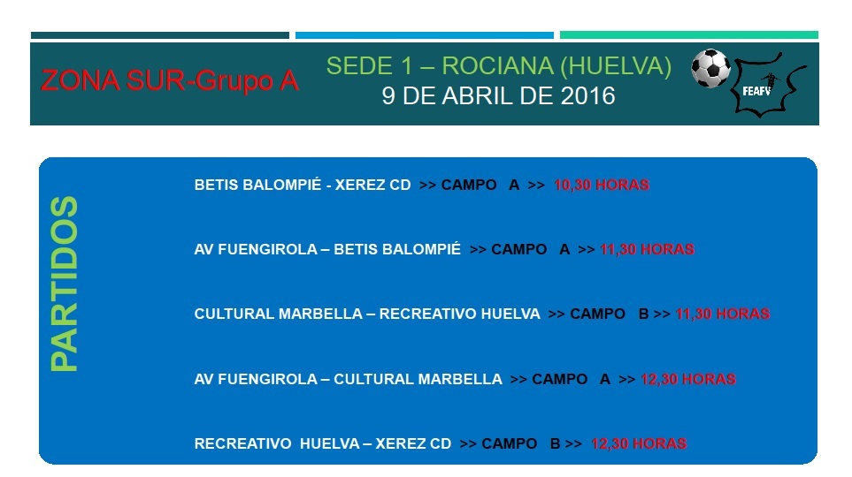 Redacción, 1 de abril de 2016. El próximo sábado 9 de abril la localidad onubense de Rociana del Condado acogerá la primera sede de la Liga Solidaria FEAFV – Zona Sur. Tras esta primera sede, serán otras localidades como Gibraleón, Castellar o Málaga las que acojan el resto de sedes tanto del grupo A como del grupo B