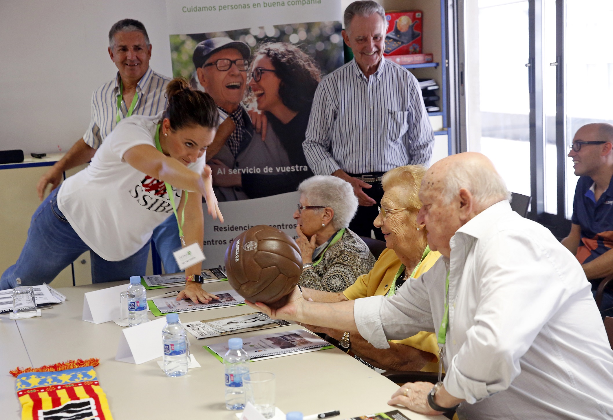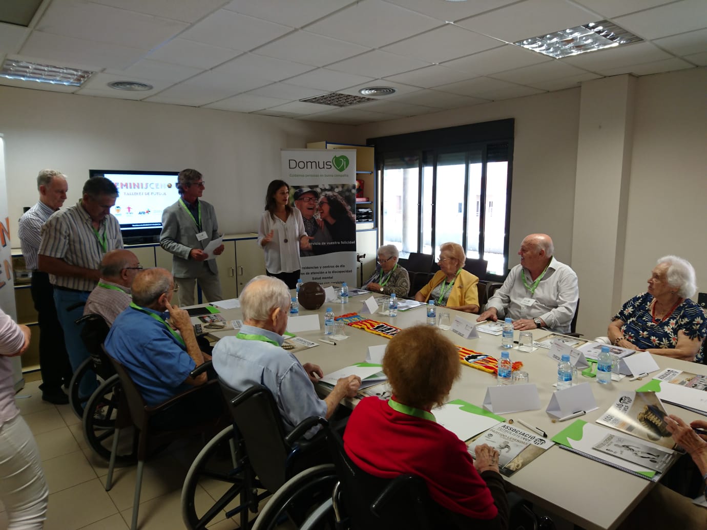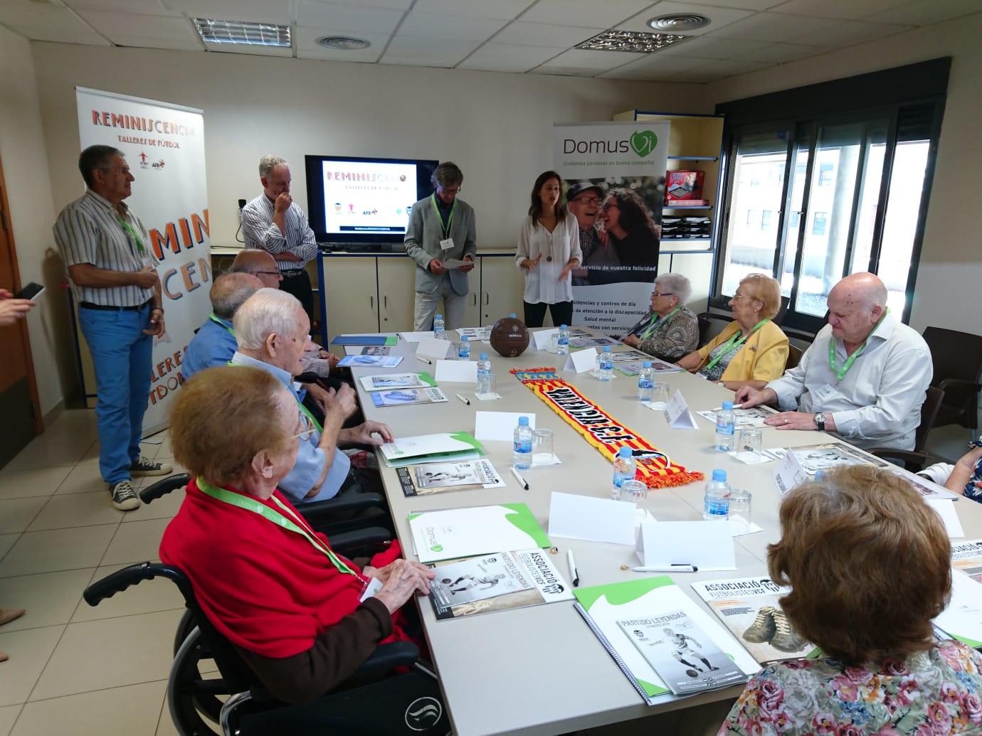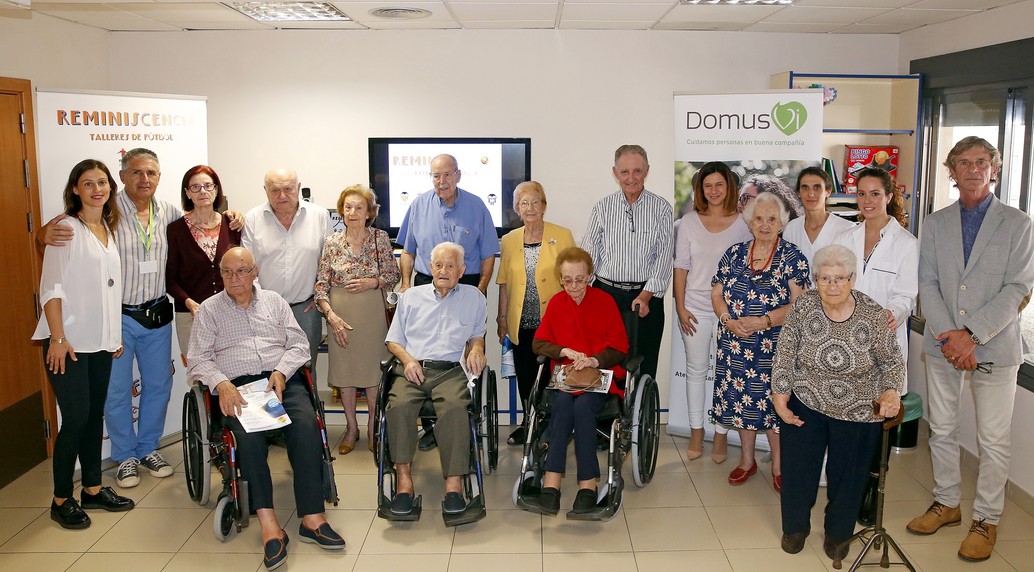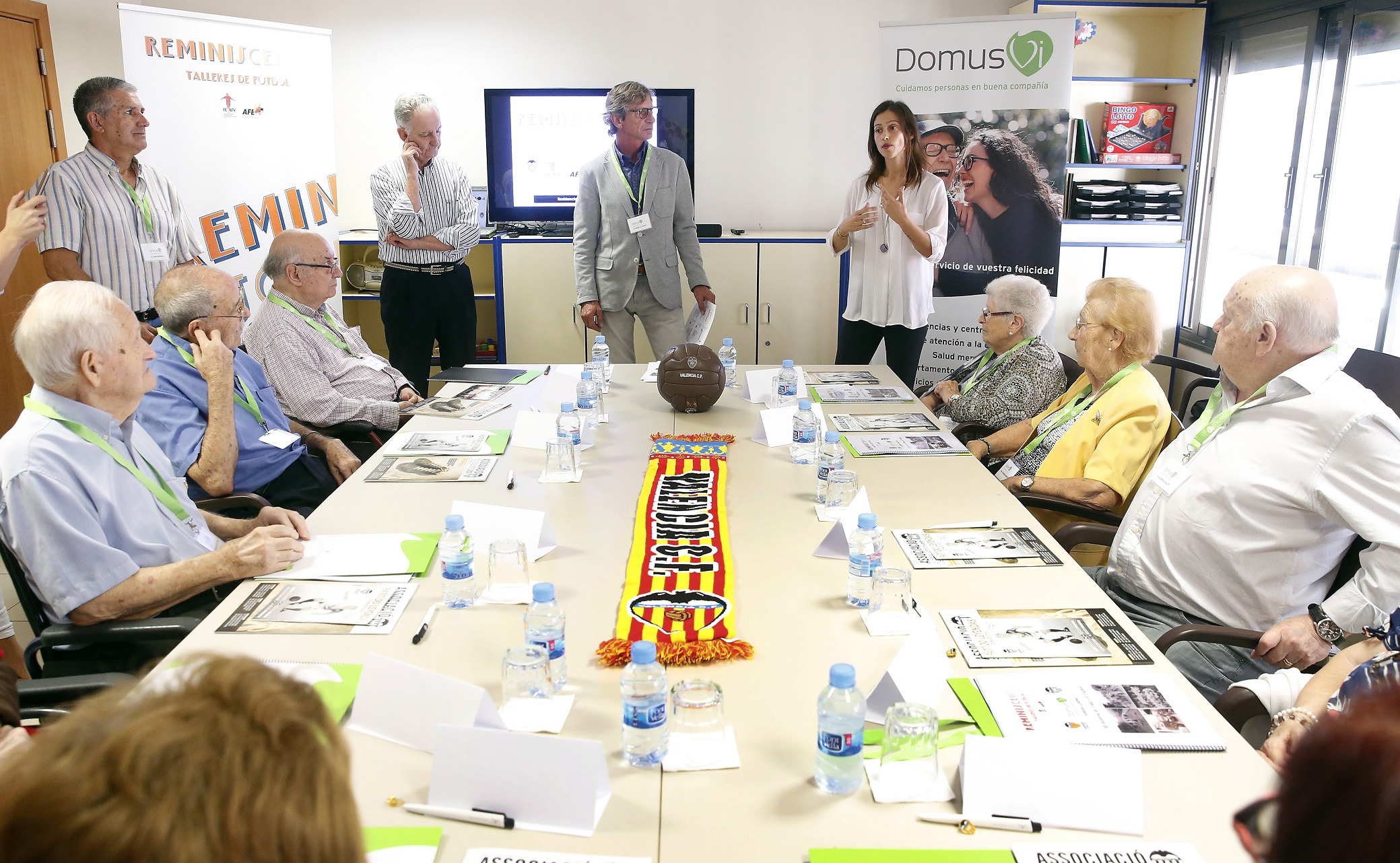 En la sesión inaugural, además de los participantes usuarios de la Residencia y sus familiares más cercanos estuvieron presentes Libertad Garis, Responsable Atención al cliente DomusVi Zona Levante; María Carmen Vicente Arcos, Directora de la Residencia DomusVi Ciudad de las Artes; Juan María Zorriqueta, ex futbolista profesional y presidente FEAFV; Ana Heredia, Responsable del Dpto. de comunicación de la asociación de Futbolistas del Valencia CF; y Guillot, Bossio y Catafau, ex futbolistas valencianistas y colaboradores del taller.