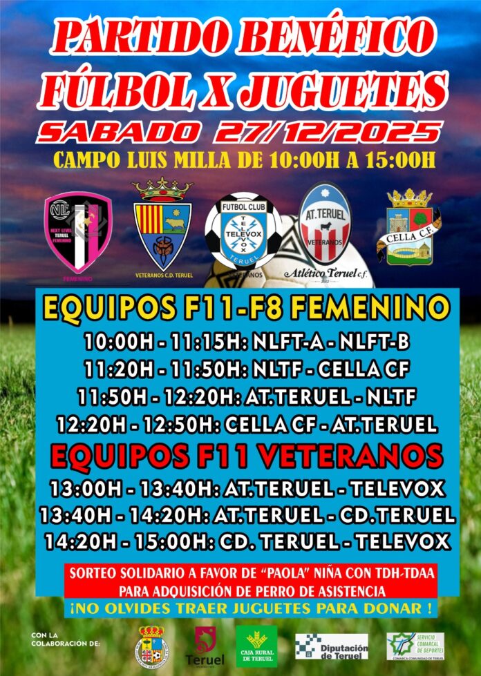 Teruel, 29 de diciembre de 2025. El pasado sábado 27 de diciembre, el campo municipal Luis Milla fue el escenario del torneo benéfico “Fútbol por juguetes”, una jornada solidaria que reuniró a equipos femeninos y veteranos del fútbol turolense con un doble objetivo: recoger juguetes para niños desfavorecidos y recaudar fondos en apoyo a Paola, una niña de 5 años con trastorno del espectro autista y déficit de atención, cuya familia necesita ayuda para la adquisición de un perro guía.