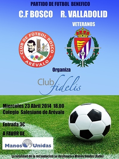 Valladolid, 23 de abril de 2014. Coincidiendo con la Fiesta de la Comunidad de Castilla y León, la Asociación de veteranos del Real Valladolid disputó un partido benéfico, contra el Club de Fútbol Bosco, a favor de Manos Unidas en la localidad abulense de Arévalo.