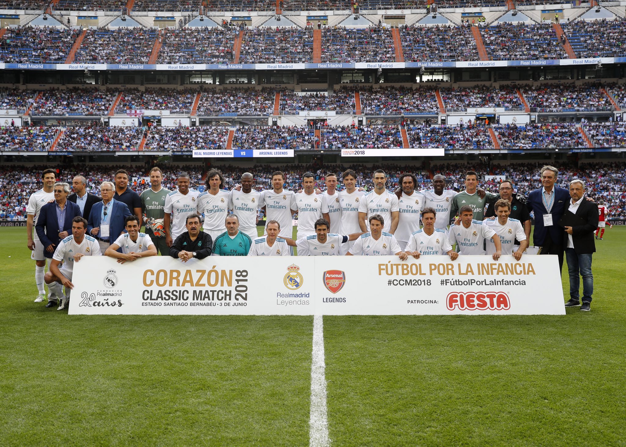 Madrid, 2 de junio de 2018. El Santiago Bernabéu vivió una gran fiesta solidaria con la novena edición del Corazón Classic Match que, en esta ocasión, reunió a las leyendas del Real Madrid y Arsenal bajo el lema Fútbol por la infancia. El conjunto blanco venció al inglés (2-1) con goles de Raúl y Guti en un partido cuyos beneficios se destinarán a los proyectos de la Fundación Real Madrid que están dirigidos a los niños más necesitados.