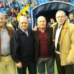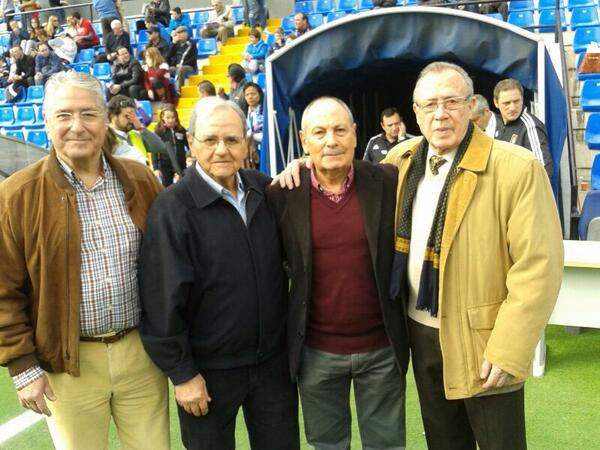 José Juan, José Soler ‘Rayo’, capitán y componente de la plantilla del Hércules en el ejercicio 59-60, el ex árbitro alicantino Pérez Gallego y el Presidente de la Asociación de los Veteranos del Hércules CF, Rafael Gallar, saltaron al terreno de juego del estadio Rico Pérez en representación de todos los futbolistas que compartieron vestuario con Luis Aragonés en el club alicantino.