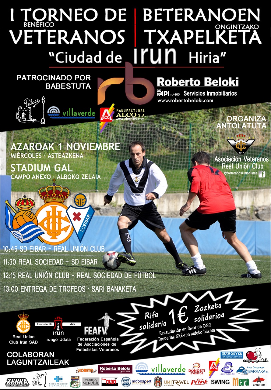 Irún (Gipuzkoa), 1 de noviembre de 2017. Las Asociaciones de veteranos del Real Unión -organizadora del evento-, de la Real Sociedad y de la SD Eibar (las tres asociaciones gupuzcoanas miembros de FEAFV) participaron en el primer Torneo Benéfico «Ciudad de Irún».