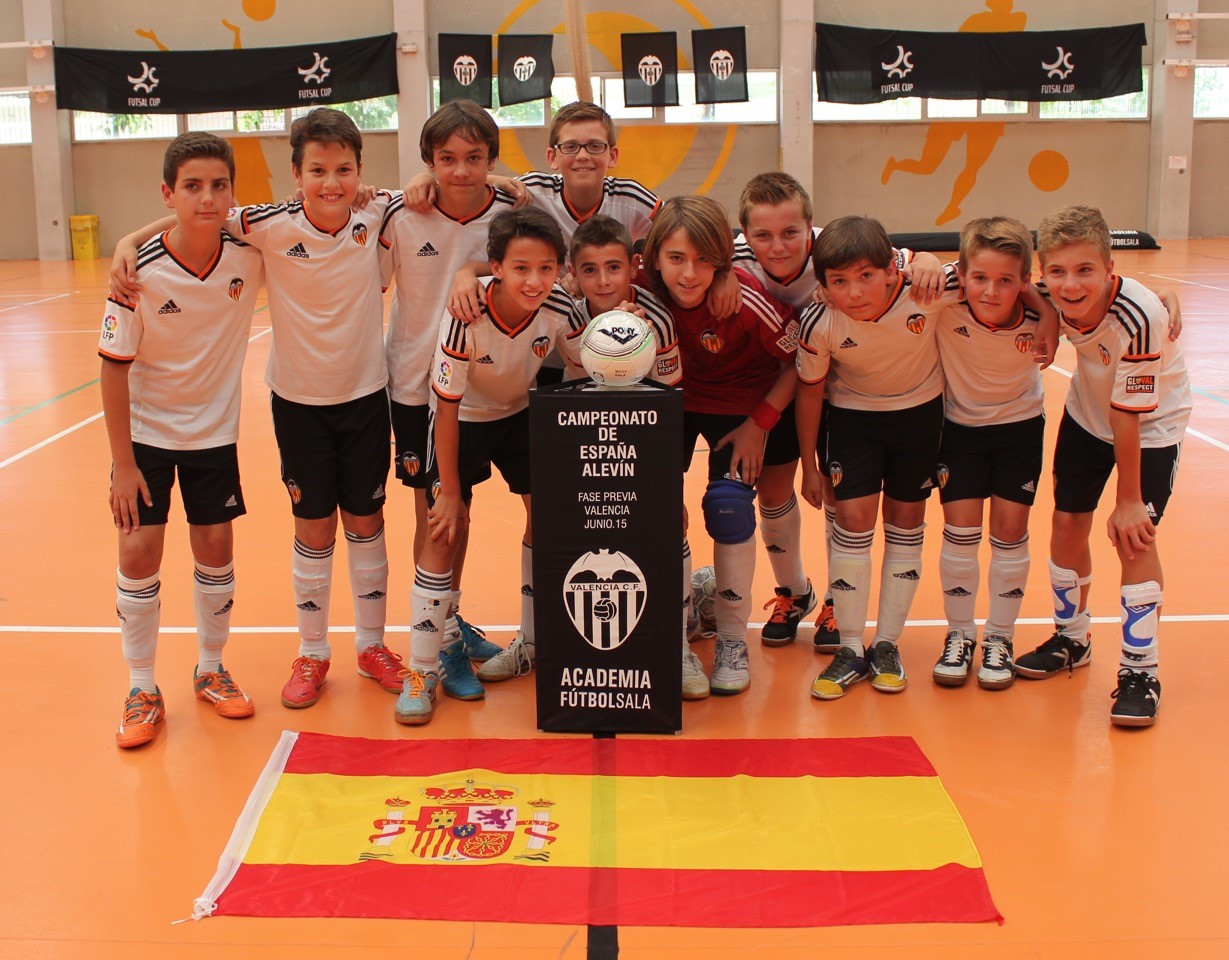 Benicalap (Valencia), 7 de junio de 2015. El fin de semana del 5, 6 y 7 de junio se disputó en el Pabellón de Benicalap (Valencia) la Fase Previa del Campeonato de España Alevín de Fútbol Sala, con el Alevín A de la Academia Futsal VCF (que gestiona la Asociación de Futbolistas del Valencia CF) como equipo anfitrión. El Campeonato fue todo un éxito, con un público que abarrotó las gradas del pabellón valenciano.