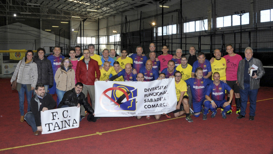 Sabadell (Barcelona), 3 de diciembre de 2017. La Agrupació Barça Jugadors participó en las jornadas deportivas que celebran anualmente el FC Taina en las instalaciones LeFive de Sabadell. Este año es la segunda vez que la ABJ asiste a esta cita para apoyar al fútbol inclusivo en una fecha que, además, ha coincidido con el Día Internacional del Síndrome de Down. El acontecimiento se celebró en forma de cuadrangular, los integrantes del cual fueron tres equipos del FC Taina y la Agrupación, que disputaron partidos de 20 minutos cada uno.