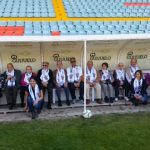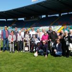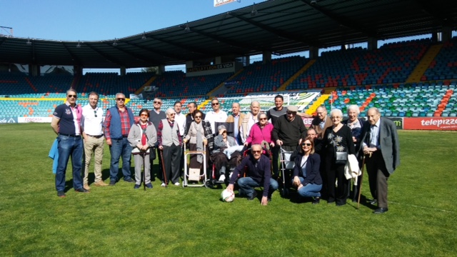 Salamanca, 12 de abril de 2017. Los participantes en el Taller de Fútbol «Reminiscencia» FEAFV & AFE visitaron el Estadio El Helmántico, inolvidable escenario de la extinta UD Salamanca. Una visita que concluyó en el césped tras pasar por los vestuarios y la sala de prensa del Estadio.