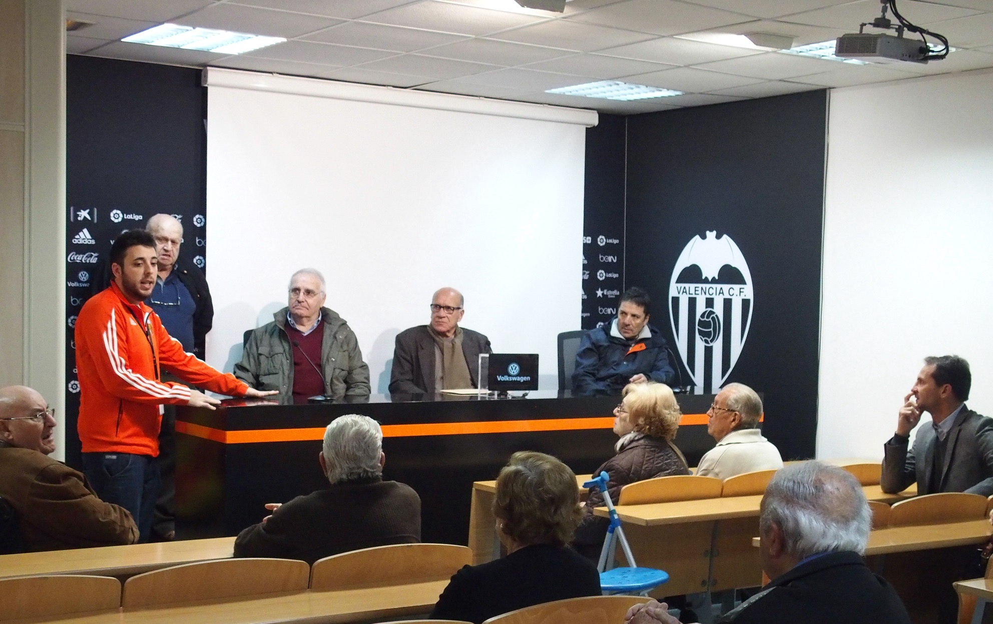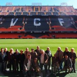 Valencia, 18 de noviembre de 2016. Los ex futbolistas chés Vicente Guillot, Óscar Rubén Valdez, Miguel Ángel Adorno, Luis Vilar y Fernando Giner -presidente de la Asociación de Futbolistas del Valencia CF- realizaron de improvisados guías para los participantes del Taller de Fútbol «Reminiscencia» de la Residencia Ballesol Patacona, en su visita al templo valencianista, el Estadio de Mestalla.
