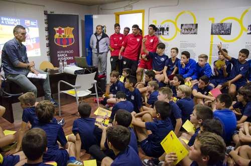 Palamós (Girona), 24 de Octubre de 2014. El ex jugador del FC Barcelona, Lluís Carreras, fue el protagonista de la jornada «Engánchate al deporte» que la Agrupación organizó el pasado viernes en Palamós. Carreras compartió su experiencia profesional con 80 jóvenes futbolistas del CF Palamós, que vivieron una sesión de entrenamiento diferente donde se habló de algunos de los valores que tienen la oportunidad de experimentar con la práctica de fútbol.