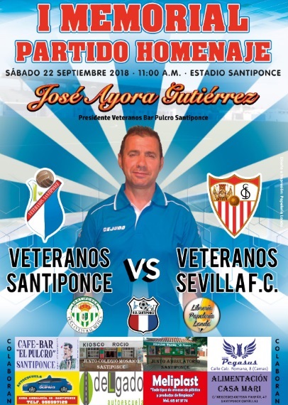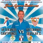 Santiponce (Sevilla), 22 de septiembre de 2018. El equipo de veteranos del Sevilla FC se desplazó hasta la localidad sevillana de Santiponce para participar en el I Memorial Partido Homenaje en recuerdo del que fuera presidente de los Veteranos Bar Pulcro Santiponce, José Ayora Gutiérrez.
